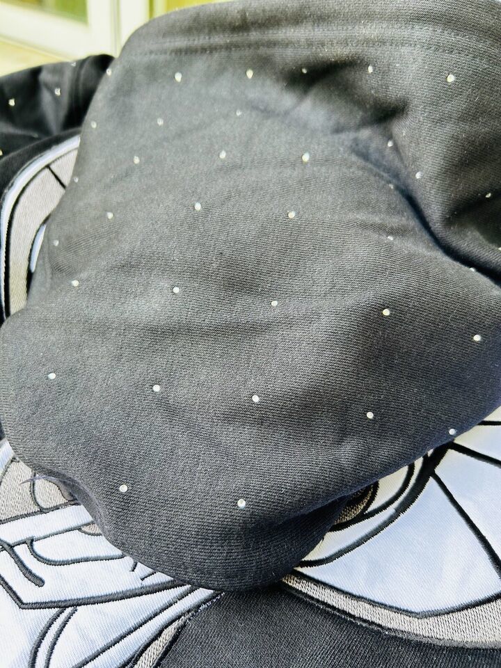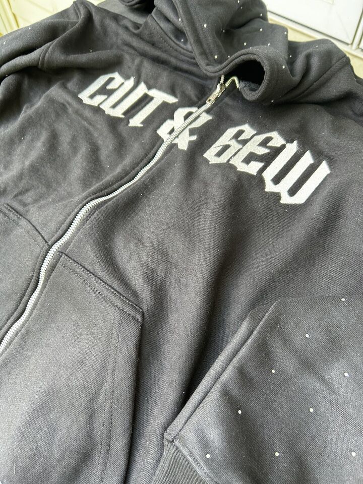 Up for-sale is (1) custom handcrafted ?Cut Sew? Embroidered jewel hoodie, with over 250,000 stitches. Made of terry cloth fabric with custom rhinestones embedded in the sleeves and hood .