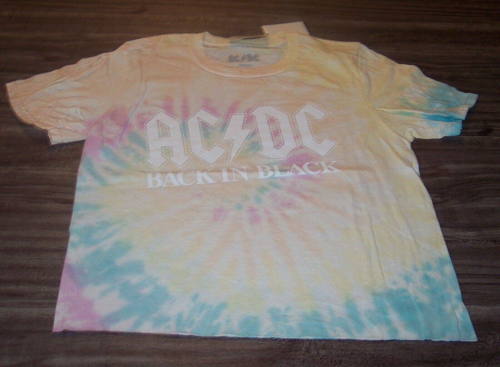 This is a WOMEN'S TEEN WOMEN'S TEEN Juniors AC-DC Back In Black Tie-Dye Band Skimmer T-shirt. It is a Size MEDIUM and is NEW with the tag. It is 17 1/2 inches from armpit to armpit and 21 inches in length. This is a Skimmer T-shirt so it is made to be shorter and not hang down over the waistline. The bottom edge is unhemmed to give it a vintage style. It is a Tie-Dye so every shirt is unique. D3AG