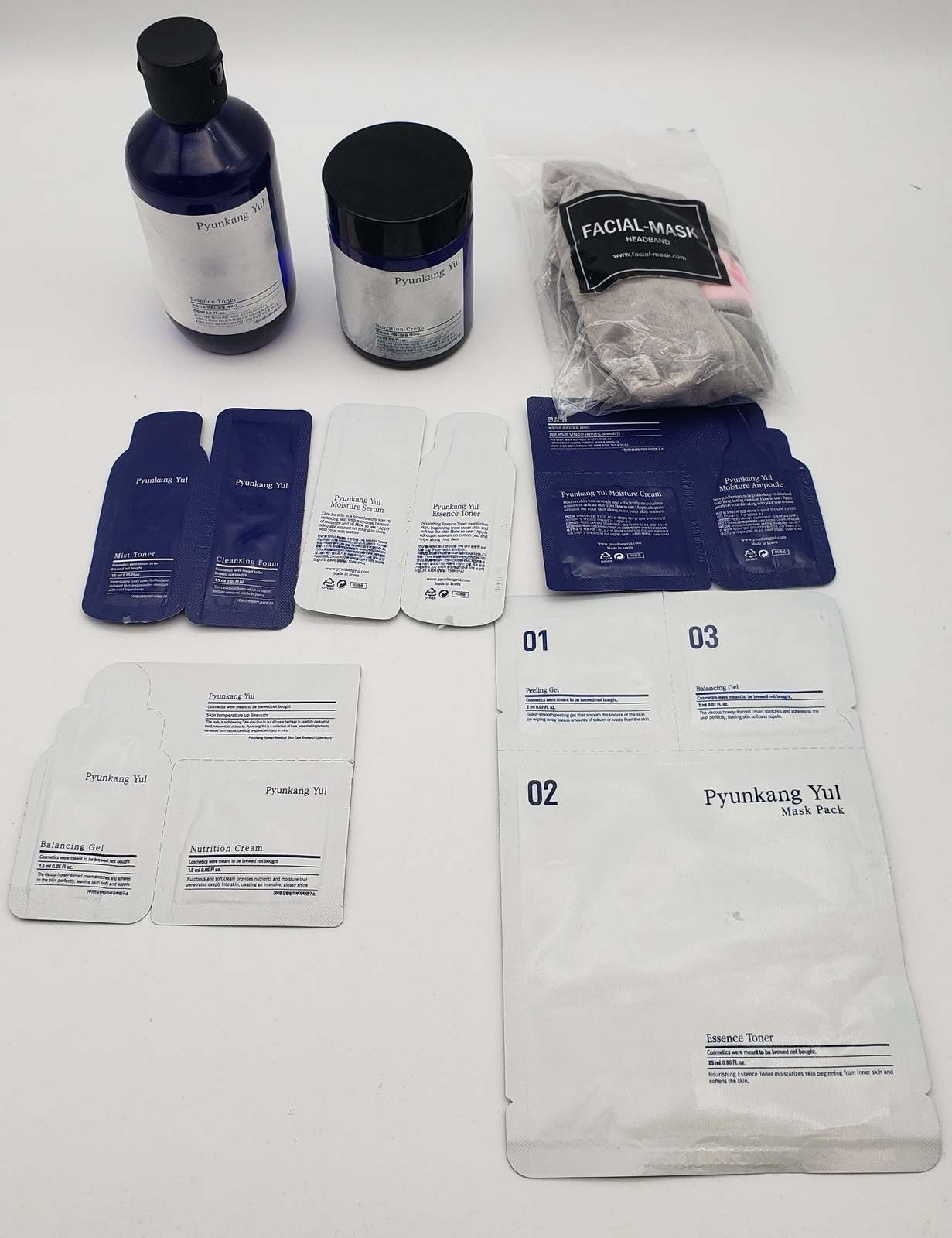 The bottle of moisture serum broke in shipping, but all other items are new an unopened. Pack includes Essence Toner, Nutrition Cream, Cleansing Foam, Moisture Serum Packets, Balancing gel, facial mask, and Mask pack