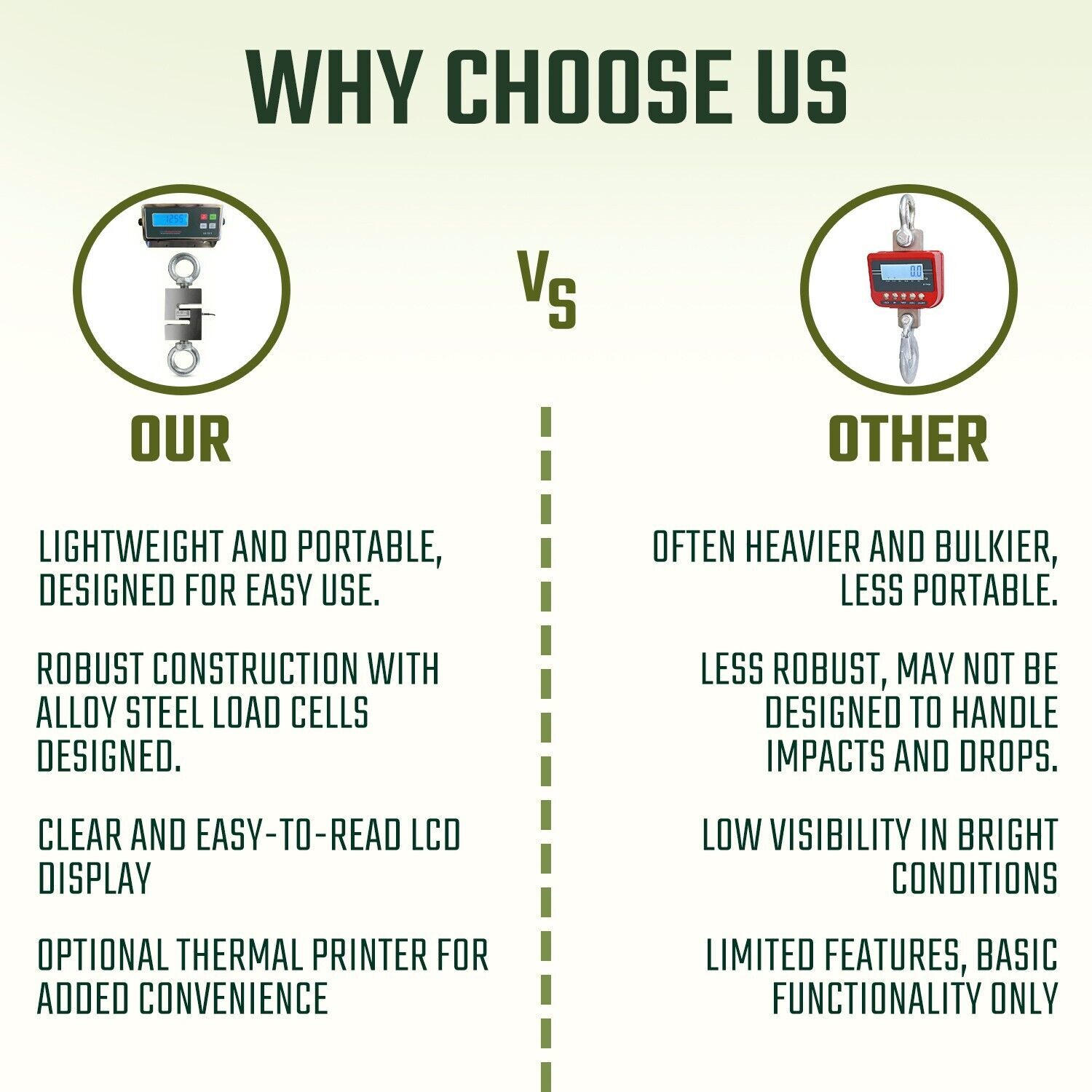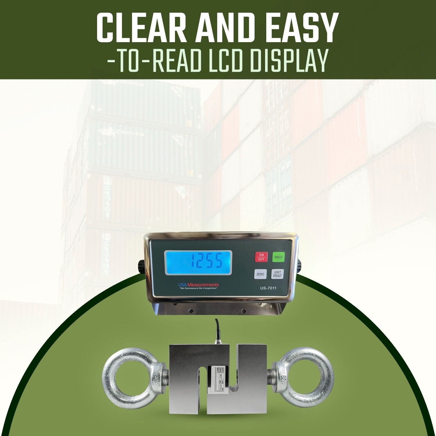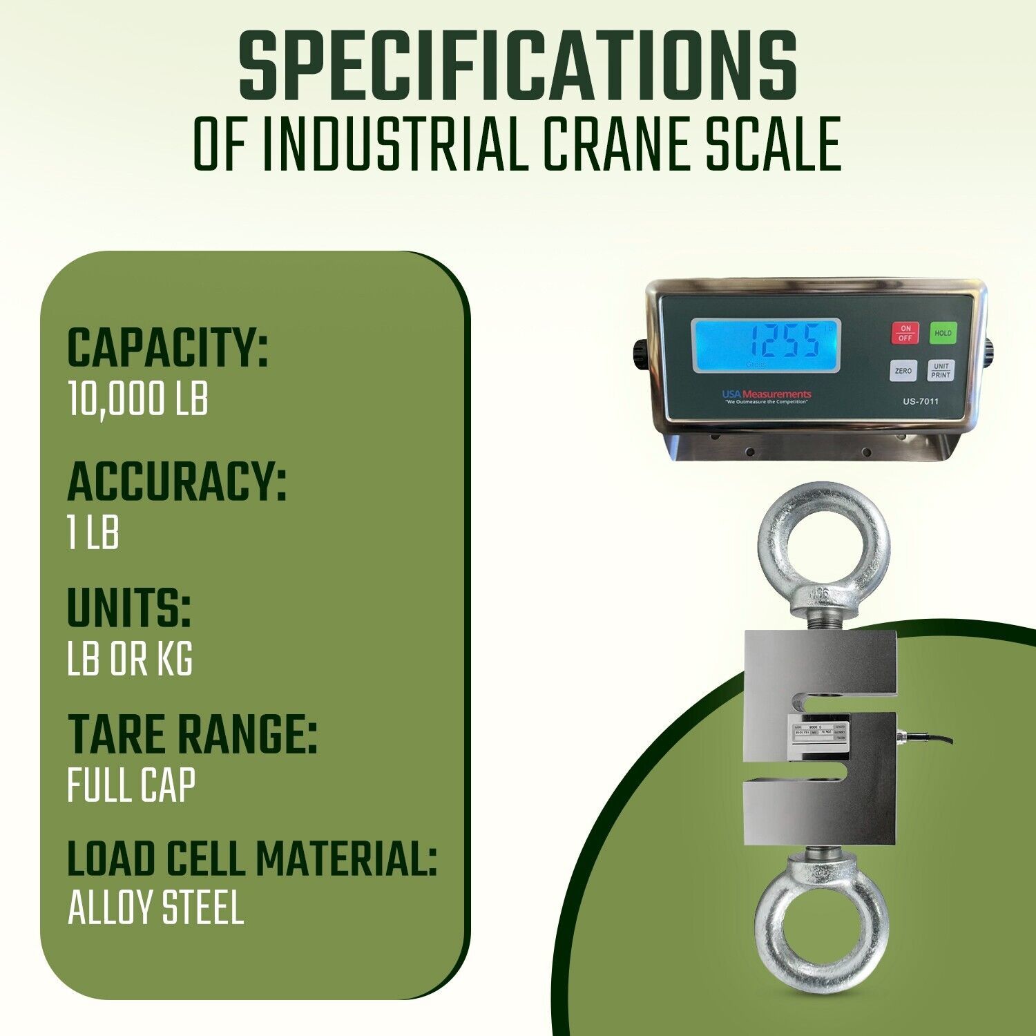 USA Measurements offers our US-CSK-10K Hanging Scale, designed for precision in tension and compression measurements up to 10,000 lb. This S-Type scale is ideal for industrial applications, ensuring reliability and durability. This includes our US-7011 indicator, S-type Load Cell, Two Eye hooks, Power Adapter, AAA batteries, and manual. Our S-type load cell comes with an 11 prime; braided cable, alloy steel load cell, and factory calibrated for accuracy. Specifications: ---Capacity 10,000 lb ---Accuracy 1 lb ---Load Cell Material: Alloy Steel ---Cable Length: 11 prime; ---LB/KG Selectable ---Tare Range: Full Capacity ---Power: AC Adapter or Batteries ---Optional Thermal Printer ---Warranty: 2 Year on Electronics Indicator Features: ---Smooth indicator shape ---Steady performance PCB board ---Multiple weighing units: (lb/oz/kg) ---Gross/Tare/Zero ---Low power design, longer battery usage time ---Hold function, locks the weight ---Captures Peak Weight ---Idle mode and automatic power off function ---Low-battery detection and warning ---6 digits 0.7 rdquo; tall LCD display with backlight ---Splash proof keyboard and display ---RS232 Output ---Print to an optima scale ticket printer ---Stainless steel wall mount bracket included Package Includes: ---(1) US-7011 Digital Indicator ---(2) Eye Bolts for Hanging ---(1) S-type Load Cell ---(1) 110v Power Adapter ---(3) AAA Batteries ---(1) Factory Calibration ---(1) User Manual We strive for 100% Feedback! WHY BUY FROM US? We offer a quality built product at a reasonable price. We specialize in scales and nothing else. We offer sales, service, and calibration in the largest cities throughout the United States. We stand behind our products and have a knowledgeable staff ready to help with any questions. We manufacture American made products, build custom scales, and offer only the best quality.