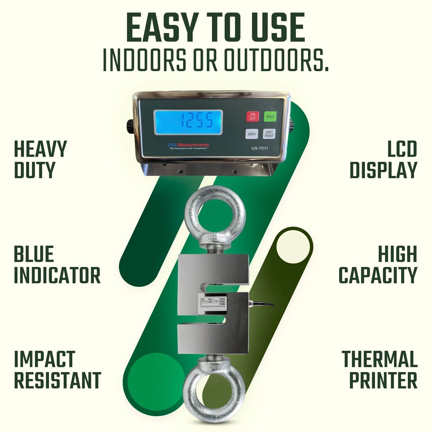 USA Measurements offers our US-CSK-10K Hanging Scale, designed for precision in tension and compression measurements up to 10,000 lb. This S-Type scale is ideal for industrial applications, ensuring reliability and durability. This includes our US-7011 indicator, S-type Load Cell, Two Eye hooks, Power Adapter, AAA batteries, and manual. Our S-type load cell comes with an 11? braided cable, alloy steel load cell, and factory calibrated for accuracy.