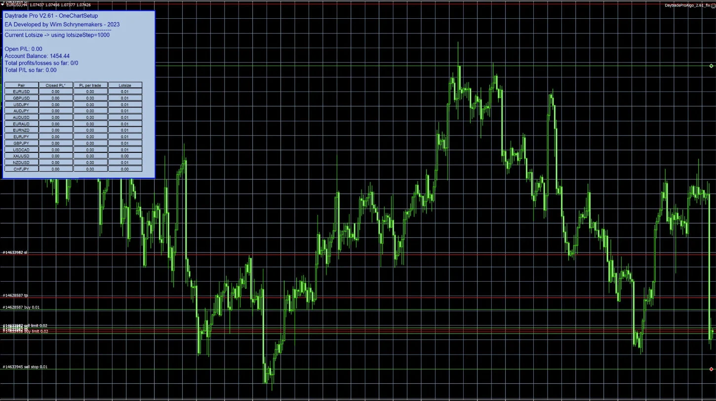 Simply open a EURUSD Daily chart, enable the โOneChartSetupโ in the parameters and set your lotsize.