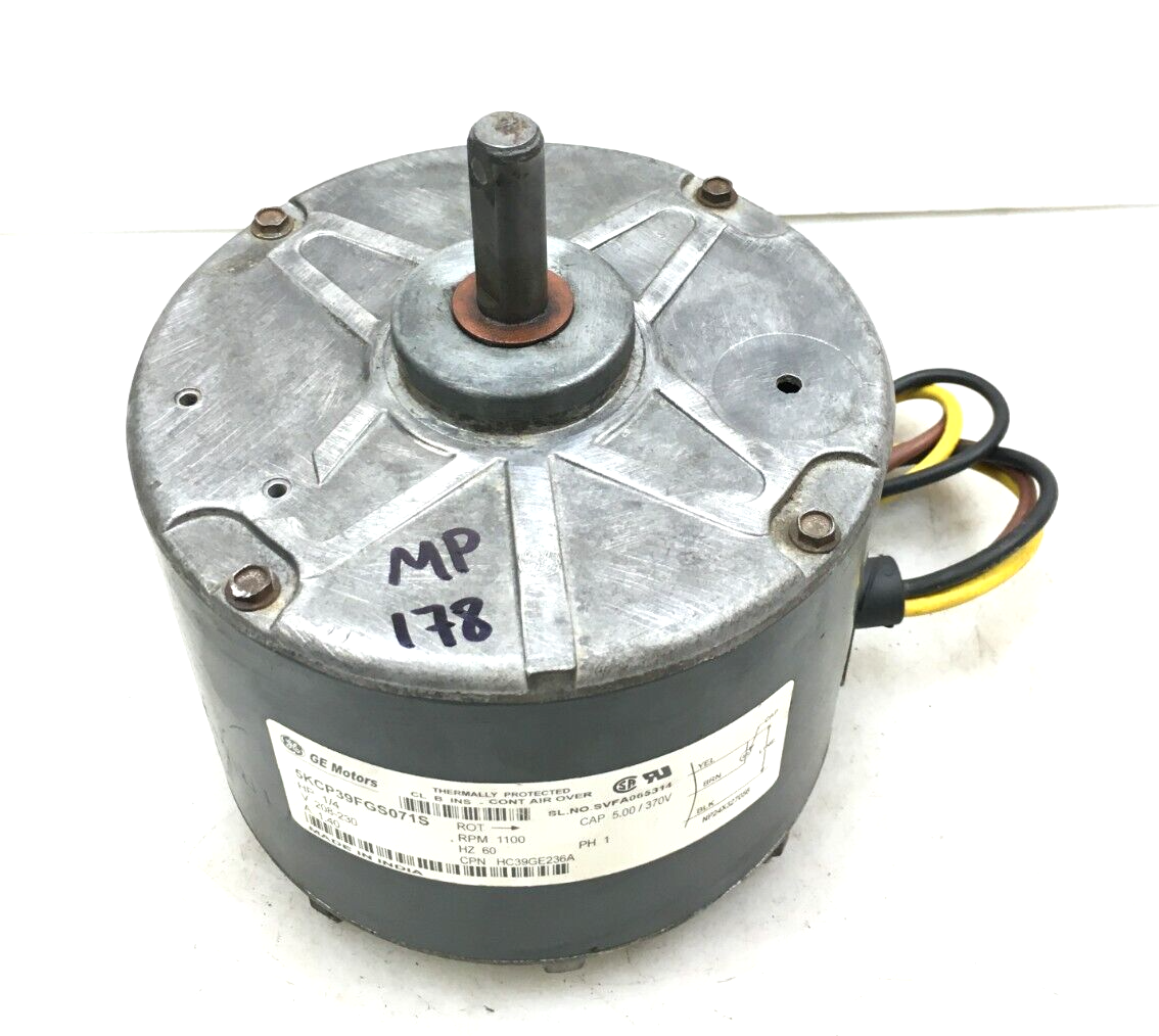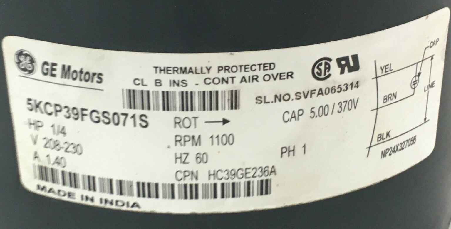 This is GE 5KCP39FGS071S Condenser FAN MOTOR 1/4 HP 208/230V HC39GE236A 1100RPM 60Hz used part.