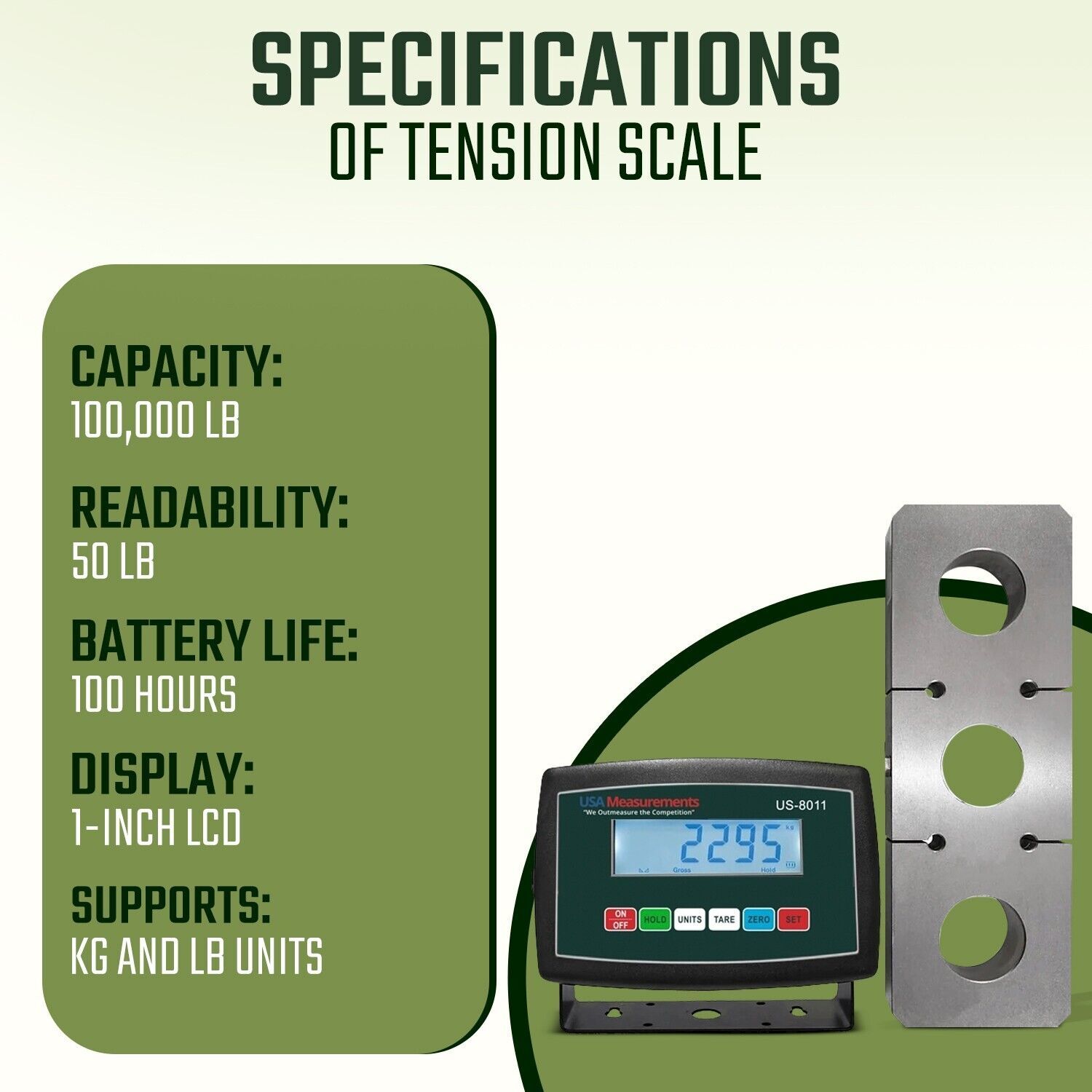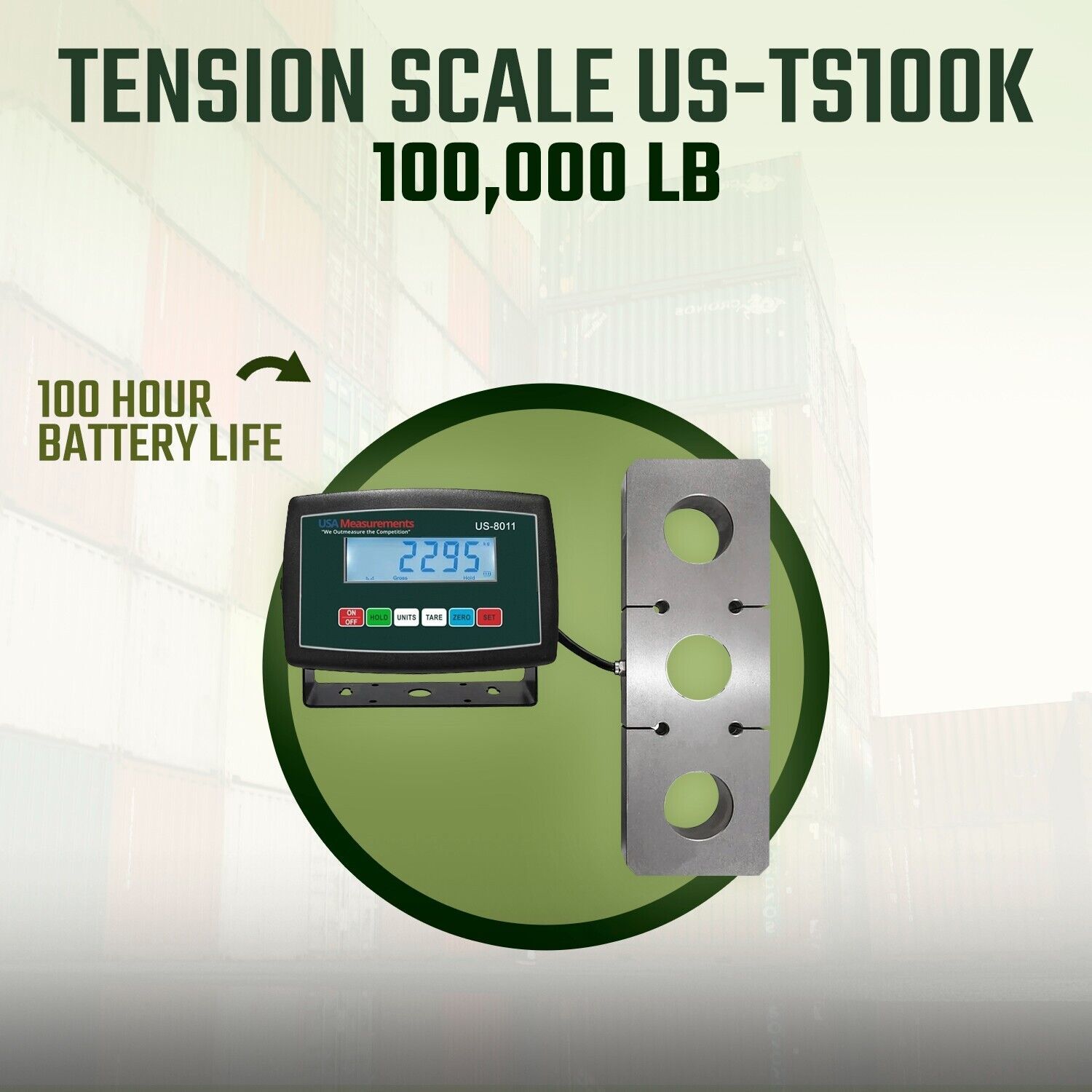 USA Measurements offers our US-TS100K tension scale for high capacity options. This model features a 100,000 lb capacity and 50 lb readability. It comes with our US-8011 digital display, LCD backlight, 100 hour battery life, and long 26? cable. This item is commonly used for overhead weighing, crane applications, portable weighing, steel applications, and much more.