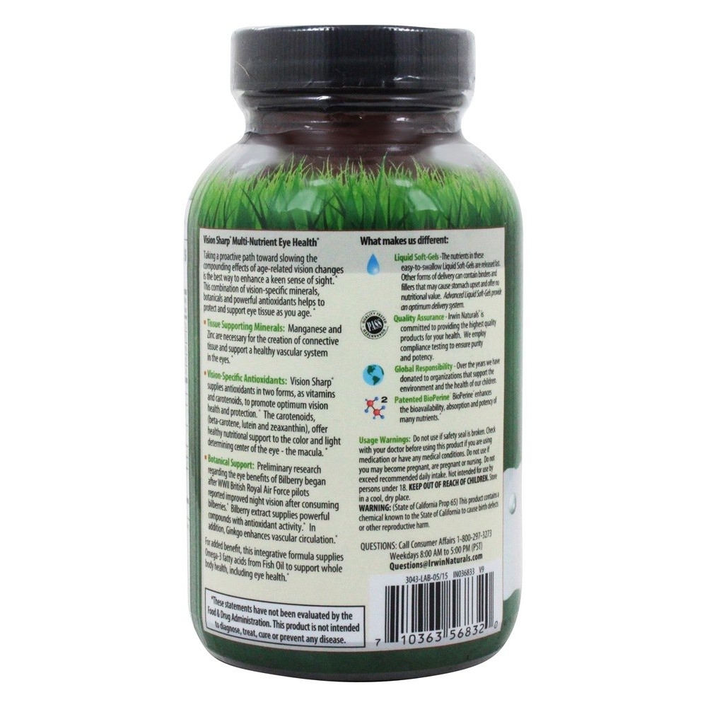 Tissue Supporting Minerals: Manganese and zinc, both necessary in the creation of connective tissue, have been researched to promote the bodys natural ability to heal itself and to protect vascular tissue. Vision-Specific Antioxidants: Vision Sharp supplies antioxidants in two forms, as vitamins and carotenoids, to promote optimum vision health and protection. The carotenoids, lutein and zeaxanthin provide healthy nutritional support to the macula, the color and light determining center of the eye. Irwin Naturals Vision Sharp Multi-Nutrient Eye Health With Lutein, Bilberry Omega-3 Oils provides powerful daily protection to slow the effects or age-related vision degeneration. Taking a proactive approach toward slowing the compounding effects of age-related vision changes is the best way to ensure a keen sense of sight. A combination of vision-specific minerals, botanicals and potent antioxidants, all researched to protect and support eye tissue, provides a powerfully effective way to promote eye health in Irwin Naturals Vision Sharp Multi-Nutrient Eye Health with Lutein, Bilberry Omega-3 Oils.