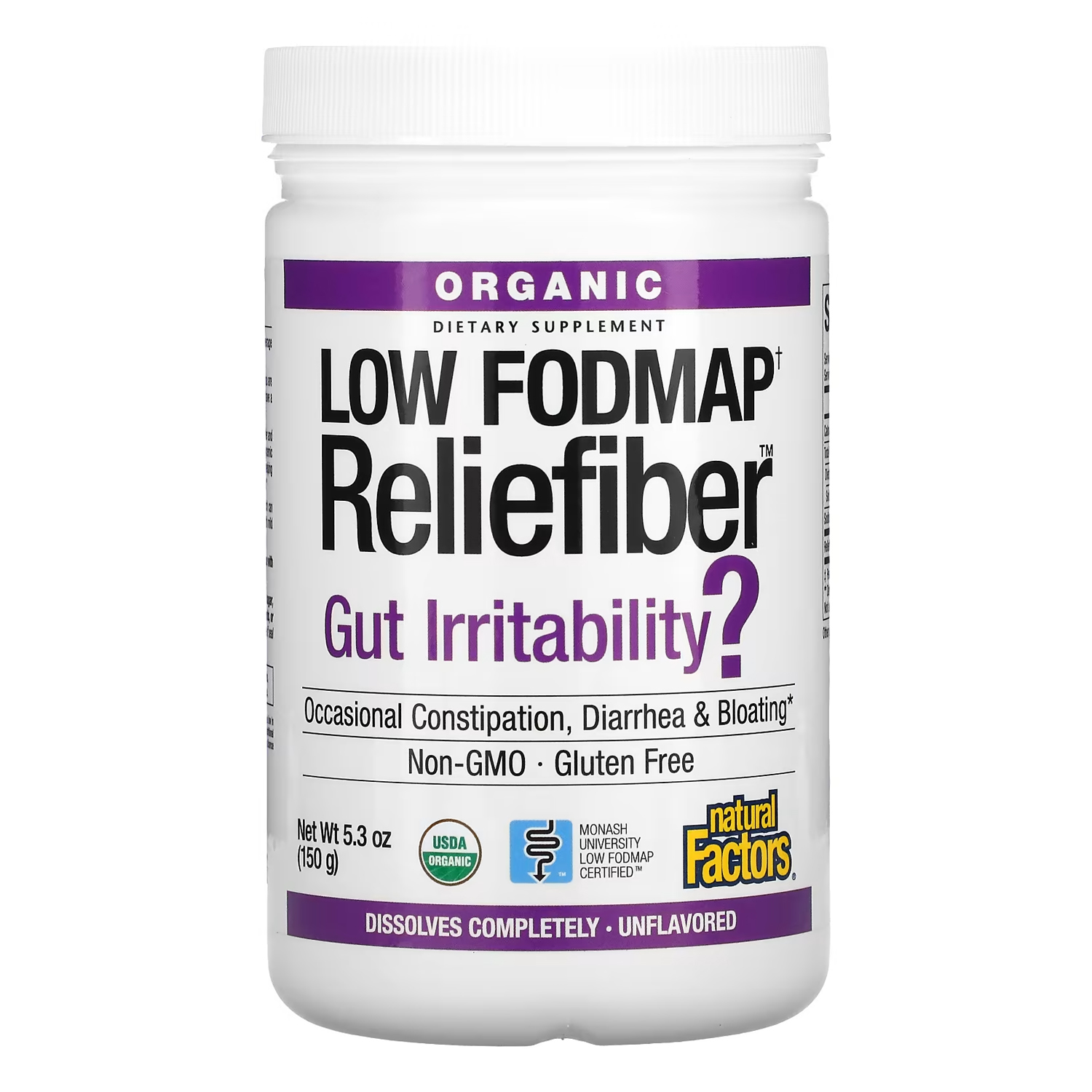 Promotes balanced digestive health by helping with occasional constipation and diarrhea without causing the typical bloating or gas of other fibers* May reduce the glycemic index of foods* Promotes healthy weight management* Tasteless, odorless, and easy to mix Manufactured by Natural Factors to ensure safety and potency in accordance with Good Manufacturing Practices (GMP) of the FDA and Health Canada. If you stick to a low-FODMAP diet, you may have trouble consuming enough fiber. Get help reaching your daily fiber goals with Low FODMAP Reliefiber! This formula contains Sunfiber, one of the worlds most researched soluble fibers. Naturally sourced from organic guar beans, Sunfiber is a highly soluble dietary fiber and prebiotic that is certified low FODMAP and organic!