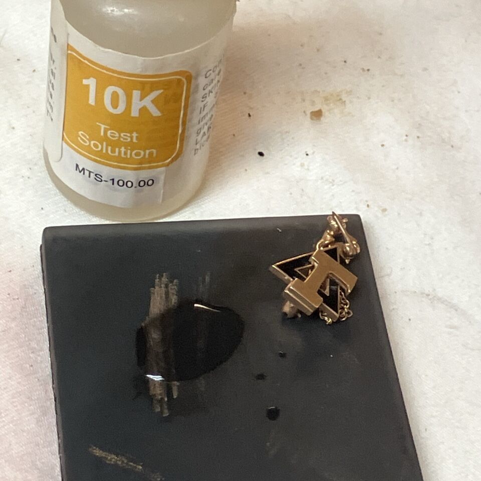 Pin is unmarked but has been tested using a scratch acid test against both 10K and 14K acid. The 10K held much stronger than the 14K.