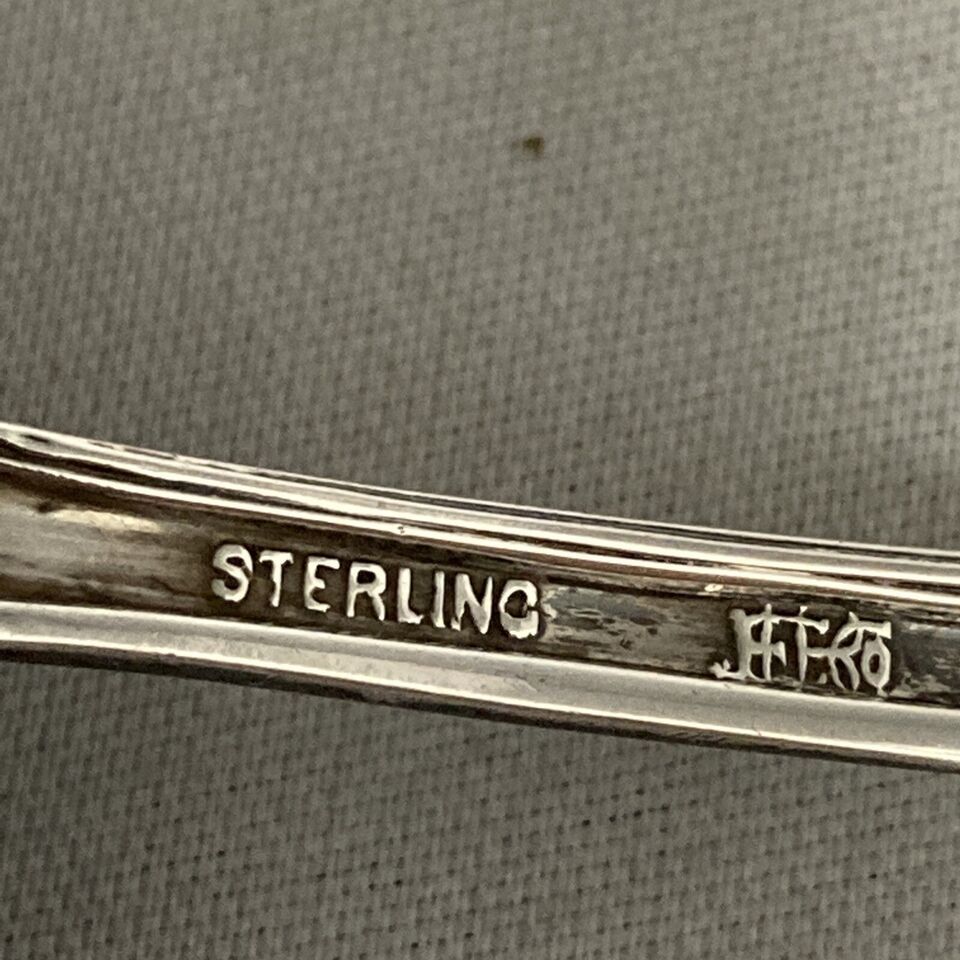 1889-1936 James E Blake mostly made novelty items and hand hammered items. Occasionally a requested piece of flatware as it appears with this berry, jelly or sugar spoon. Interesting design flair which goes with his apparent interest in Arts Crafts design. His shop was located in Attleboro Massachusetts at the corner of South Main Mill Street.