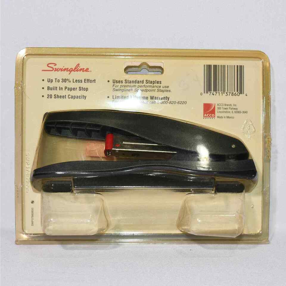 For sale is this great looking Swingline 37860 Desktop Stapler. This stapler has a 20 sheet stapling capacity and comes sealed new in package. There is some storage wear and a few cracks in the plastic but other than that and some yellowing of the package it looks to be in great shape. Check out the photos and get it for your collection today.