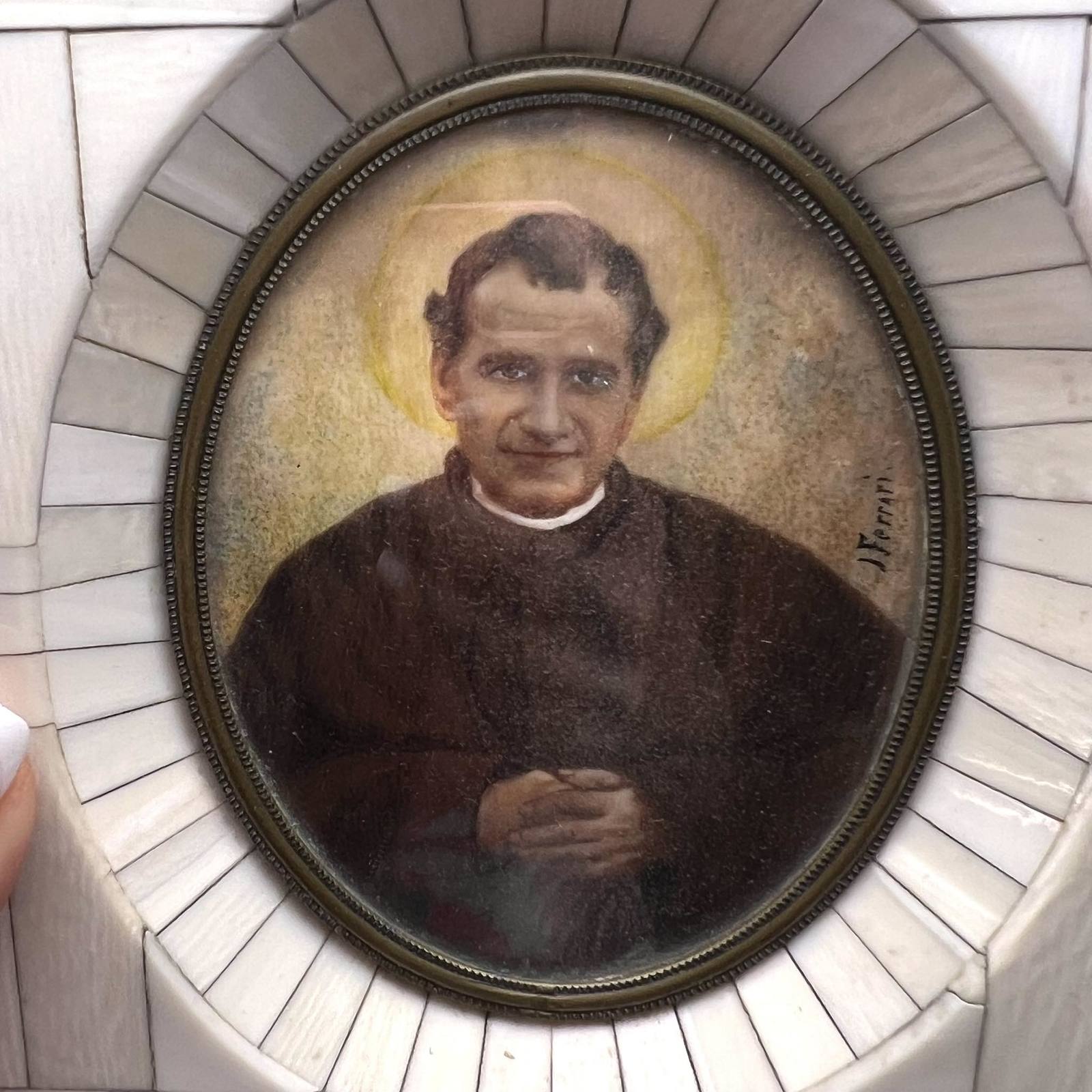 Antique hand-painted oval miniature with the image of St. John Giovanni Bosco,