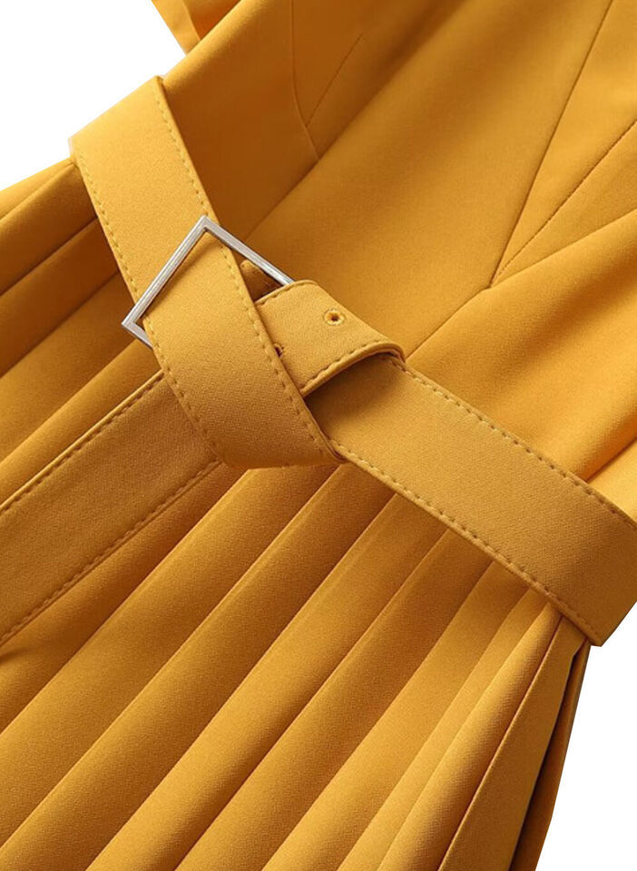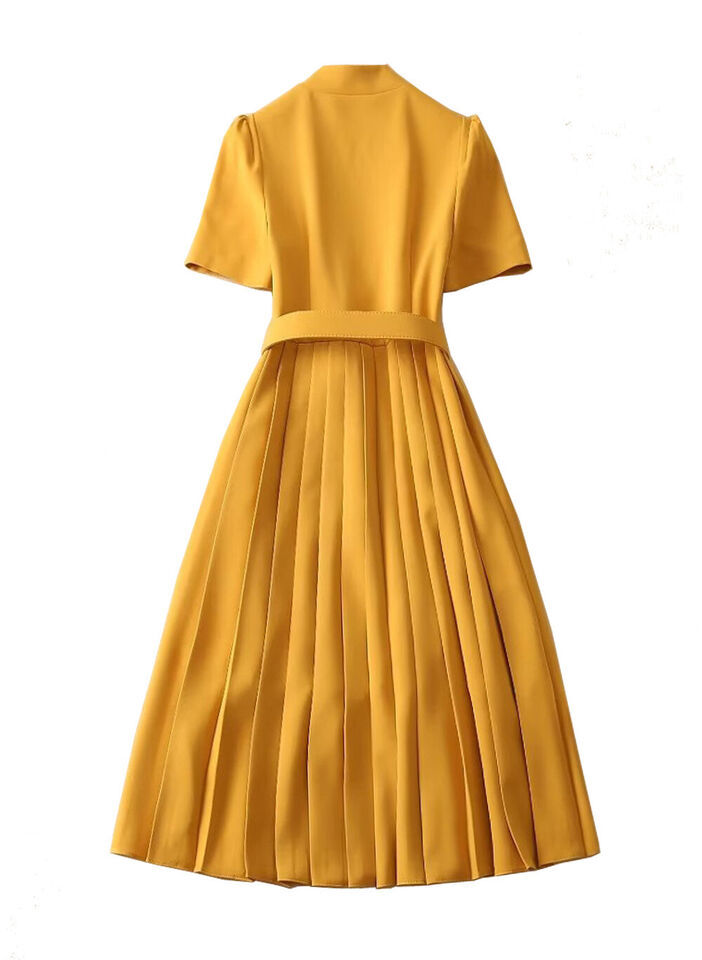 Kate Middleton Inspired Puffy Sleeve Yellow Cinched Belt Pleated Midi Dress