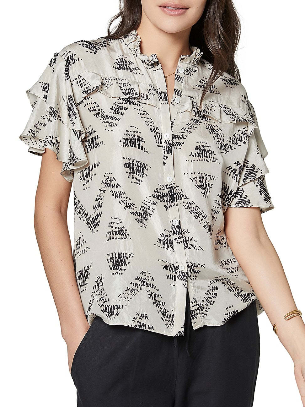 About the brand: Effortlessly feminine fashion. Sidera B Silk Top in bleached stone with crinkled design, ruffle collar, and tiered flutter sleeves Approximately 25in from shoulder to hem 100% silk Hand wash Imported. Crewneck