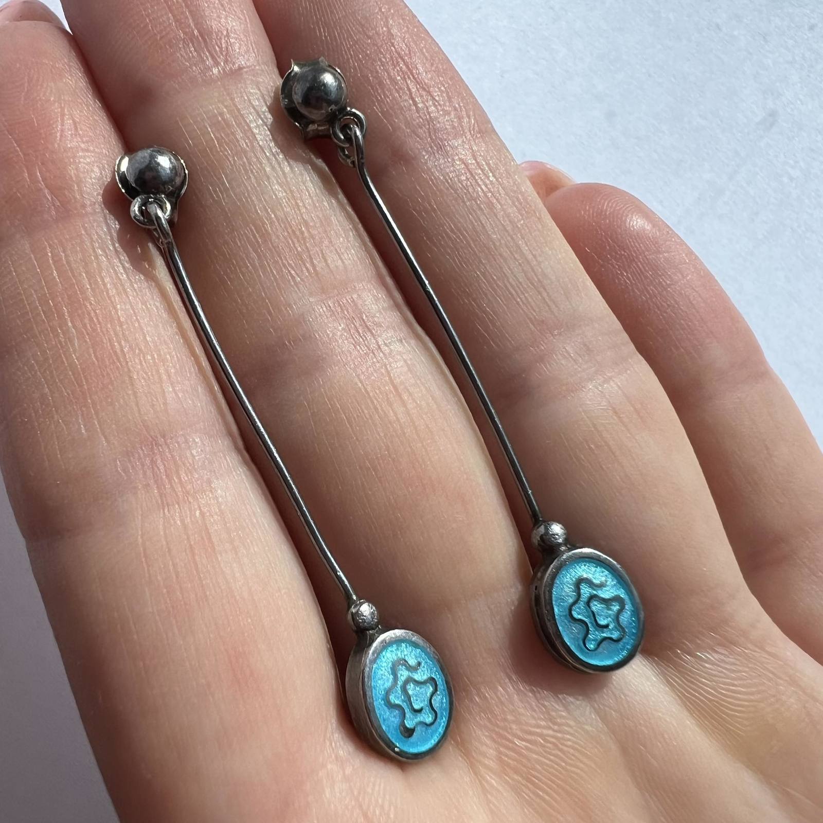 Beautiful Long Vintage Jewelry Sterling Silver 925 Women's Stud Earrings Blue Enamel 3 gr