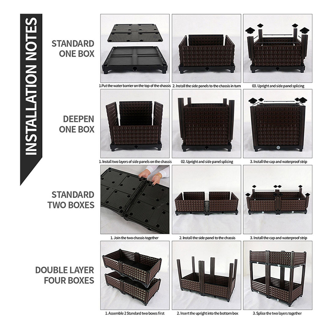SOGA Raised Garden Bed is for outdoor use. It is great for vegetables, herbs, plants, succulents, and flower growing. Space saver! Easy to assemble and disassemble. No installation tools are required - simple slip and snap. You can create multiple combinations, customizing or combining them into the sizes and shapes you need.