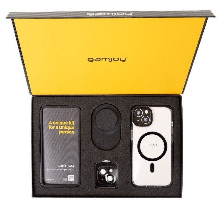 Gamjoy Elegance Kit iPhone 14 15 Pro Max Magsafe Clear Case Stand Tempered Glass Gift Box