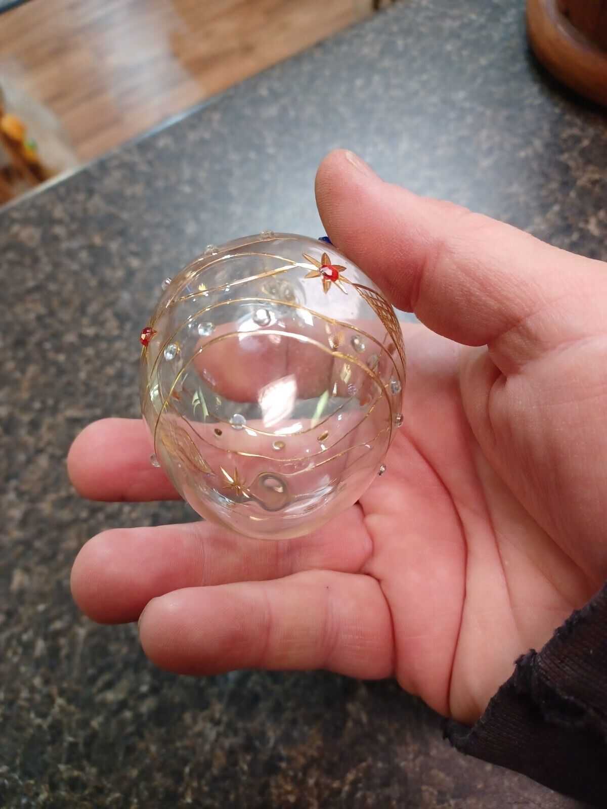 Vtg Clear Blown Glass Christmas Ornament Bauble Gold Trim 4" Egg Shaped