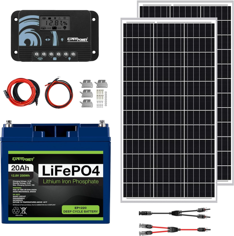 One 12V 20Ah LiFePO4 Battery, two 100W Monocrystalline Solar Panels, one 20A PWM Solar Charge Controller, one pair 10ft 12AWG Solar Cables, one pair 6ft 12AWG Battery Cables, two set Solar Panel Mounting Brackets, and one set Y Branch Adapter Cable