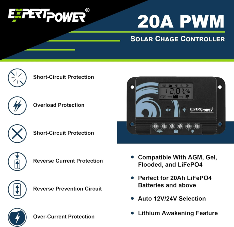 System Detect: The 20A PWM controller automatically recognizes 12V and 24V systems for quick setup and programmed to maximize LiFePO4 Battery?s life through a meticulous CC-CV charging algorithm.