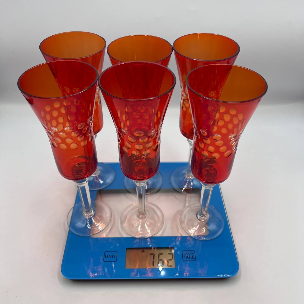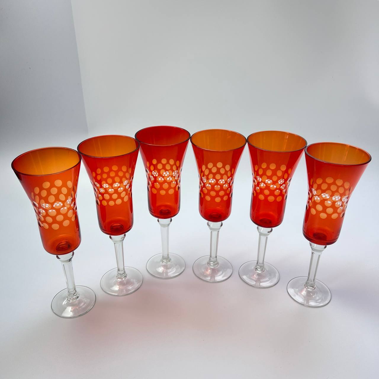 1980's Vintage Set 6 Champagne Goblets Glasses Red Crystal Glass