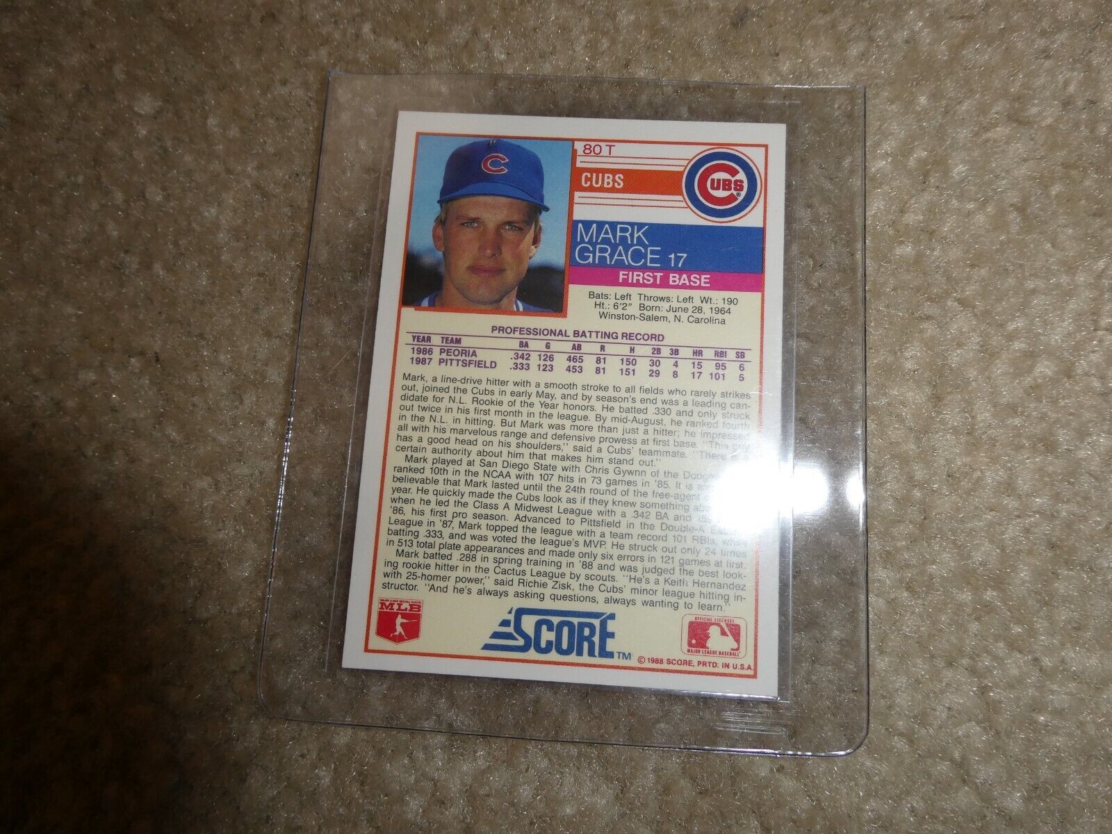 A very nice 1988 Score Traded Mark Grace rookie card, number 80T, in the pictures. Very nice looking card, near mint to mint. Zoom in for details.