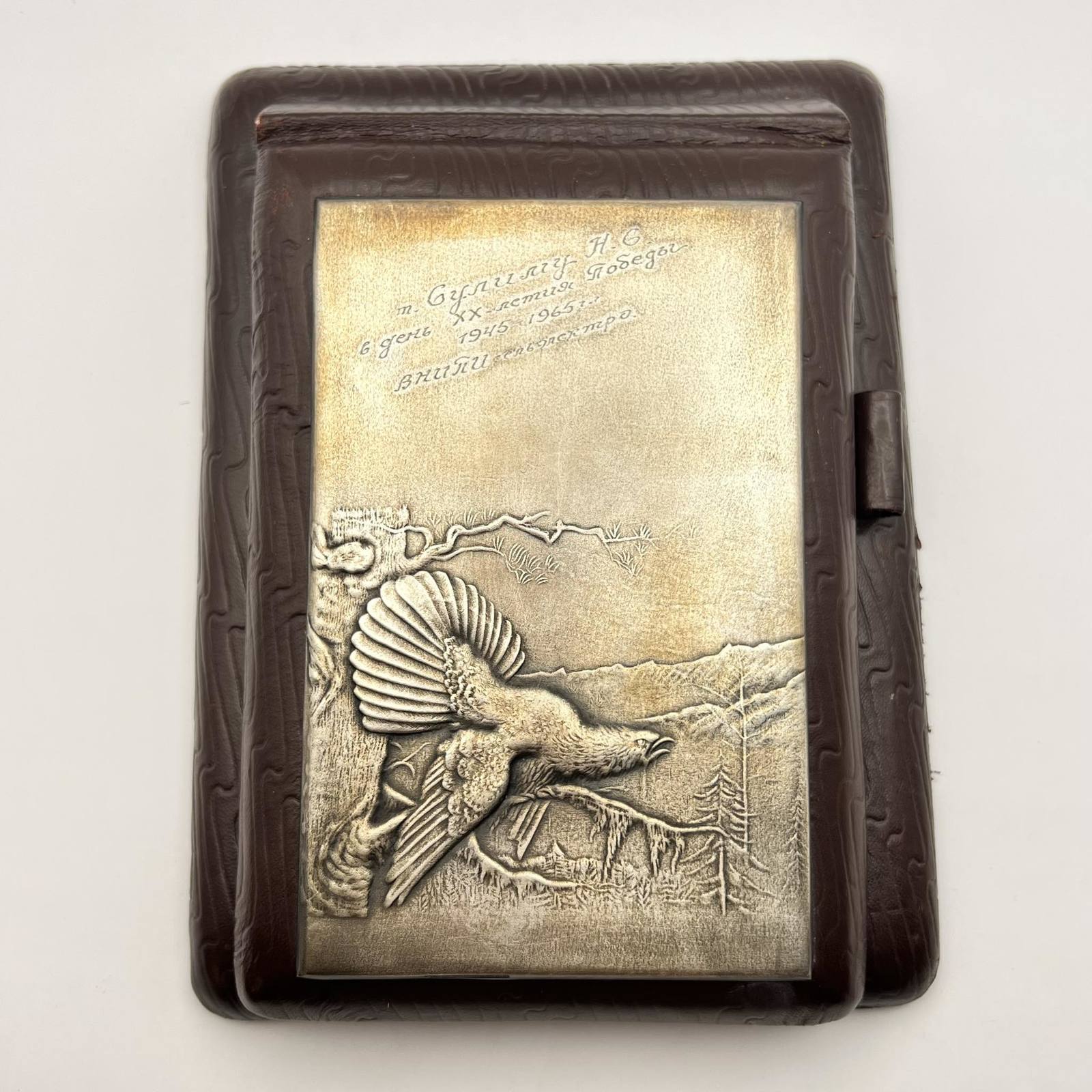 Unusual 1965 Big Vintage Soviet Silver Plated Leather Notebook Cover Capercaillie Signed
