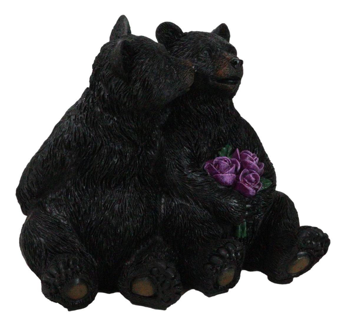 Rustic Forest Whimsical Cuddling Black Bear Couple with Flower Bouquet Figurine