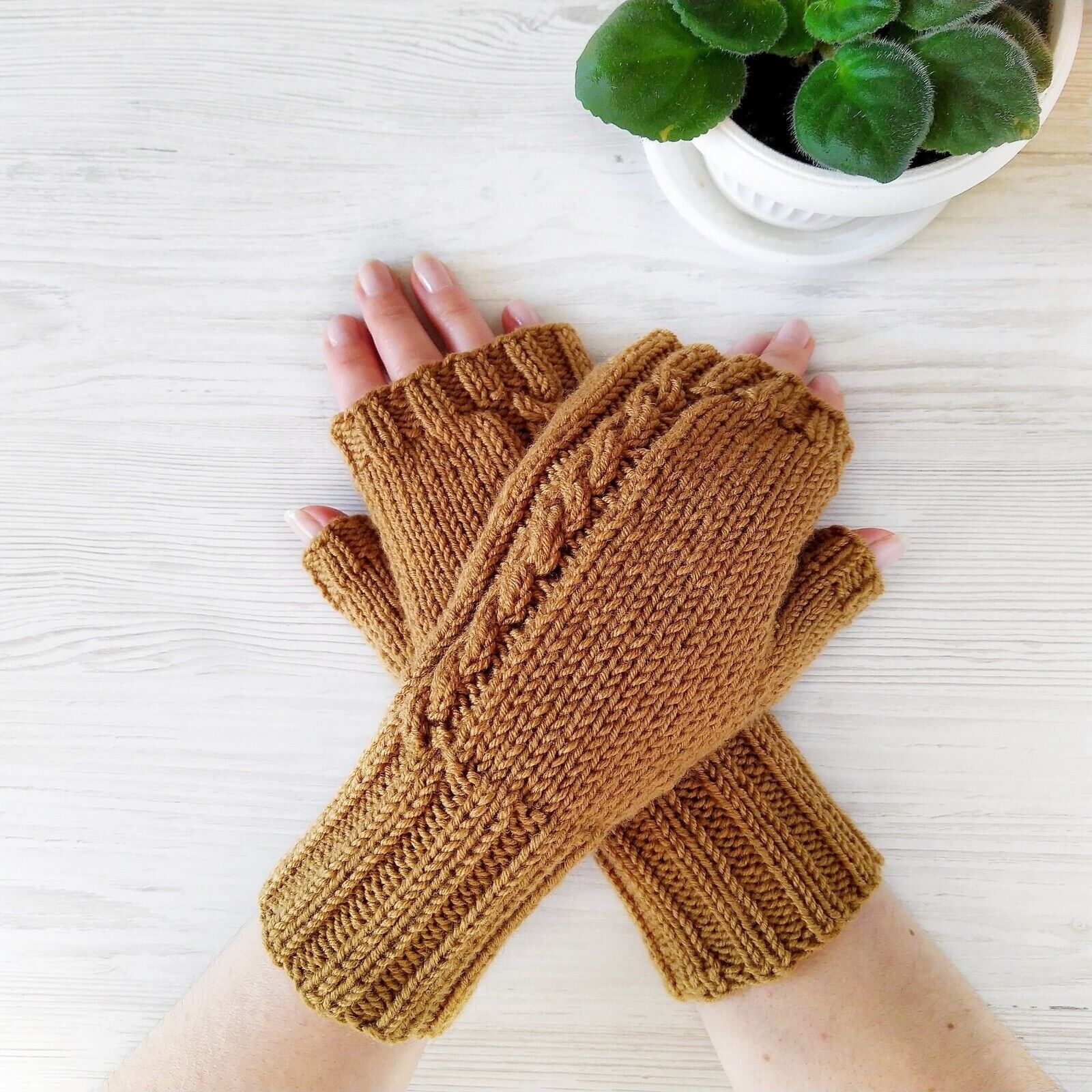 Brown Fingerless Gloves Knit Women