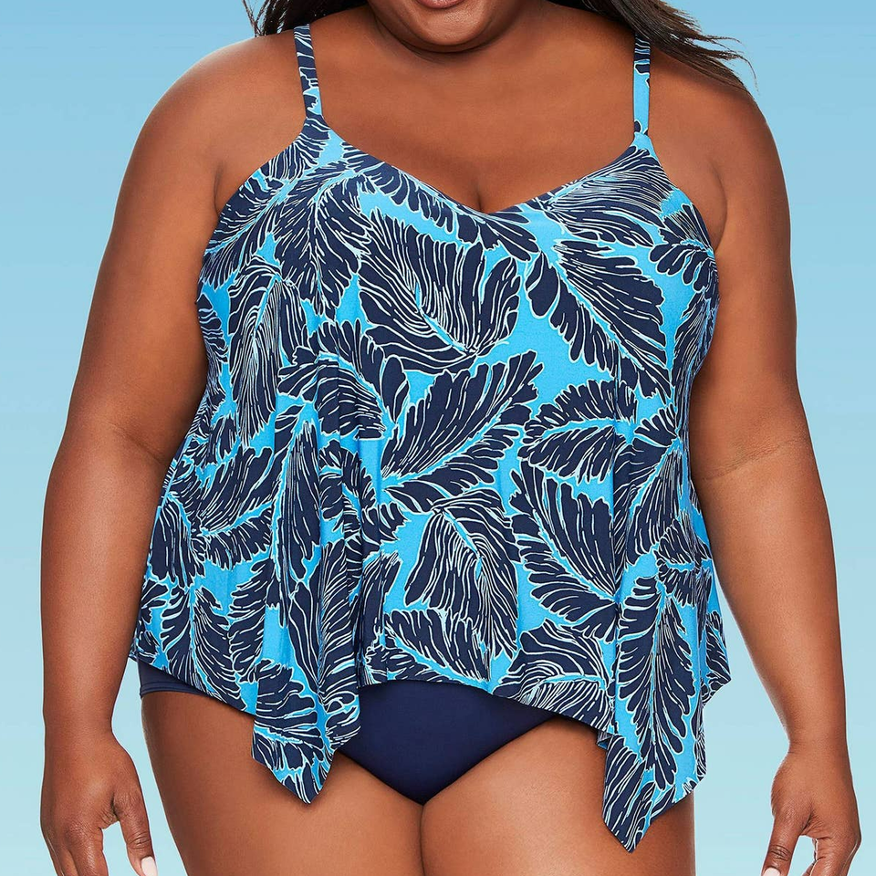 Float among the waves in this Slimming Drapey Tankini from Dreamsuit. In a tropical leaf print featuring shades of blue, the handkerchief hem delicately skims your curves, while the V neckline flatters your decolletage. Adjustable straps and non-removable foam cups make sure you feel supported, while Miracle Brands' favorite drapey microfiber keeps you comfortable.