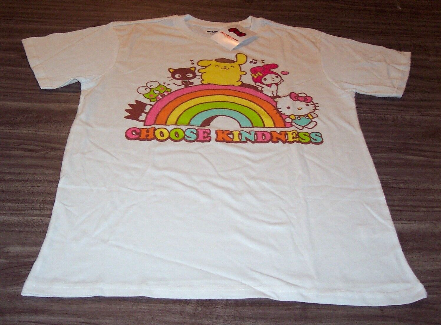 This is a Sanrio HELLO KITTY Choose Kindness T-shirt. It is a size LARGE, and it is NEW with the tag. It is 21 1/2 inches from armpit to armpit and 30 inches in length. Combine auctions to save on shipping. D2AD