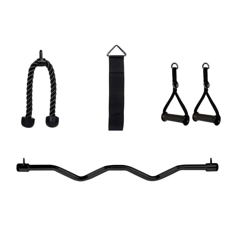 (2) D handles, dual hook curl bar, multi-purpose belt and triceps rope.