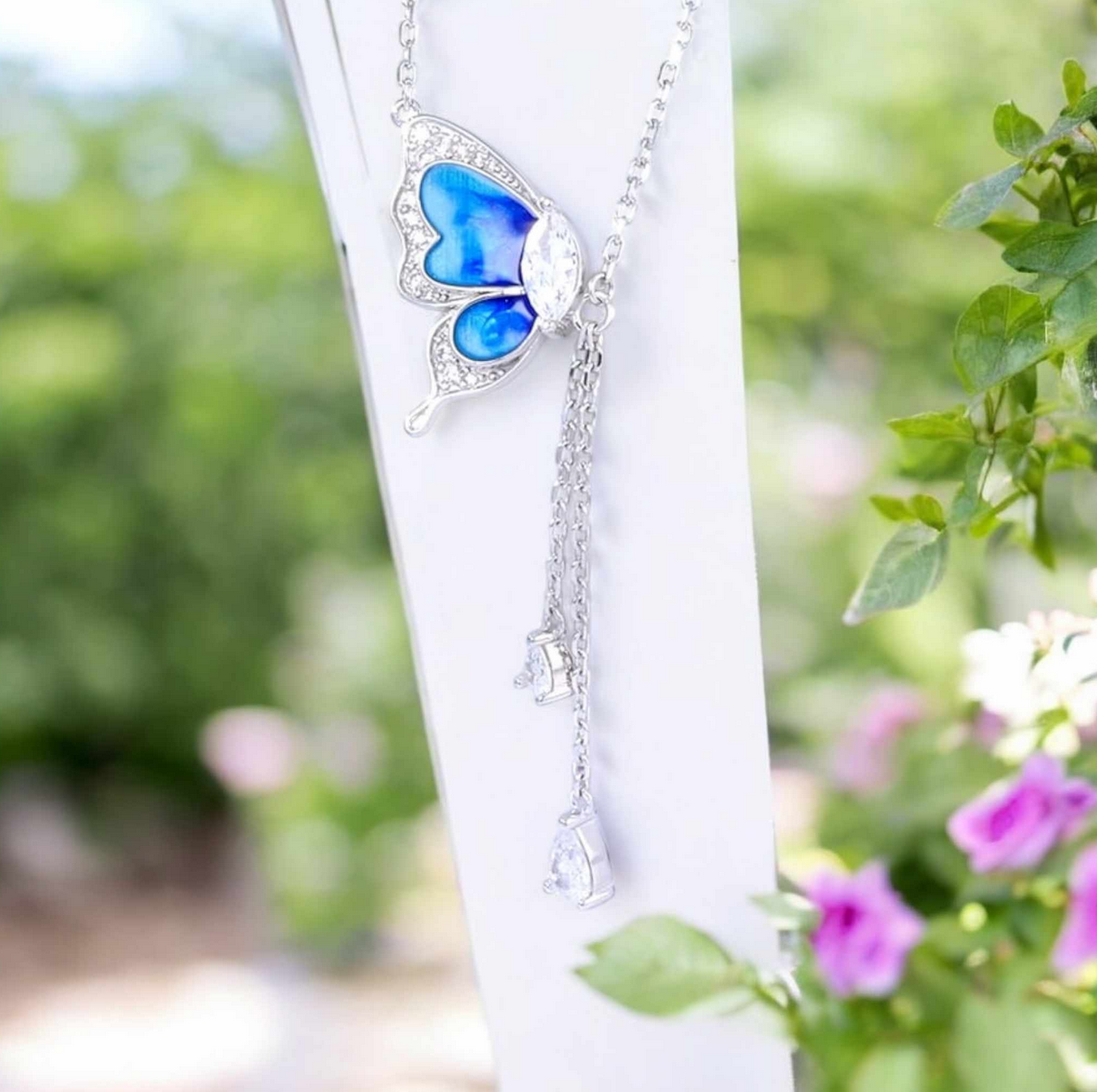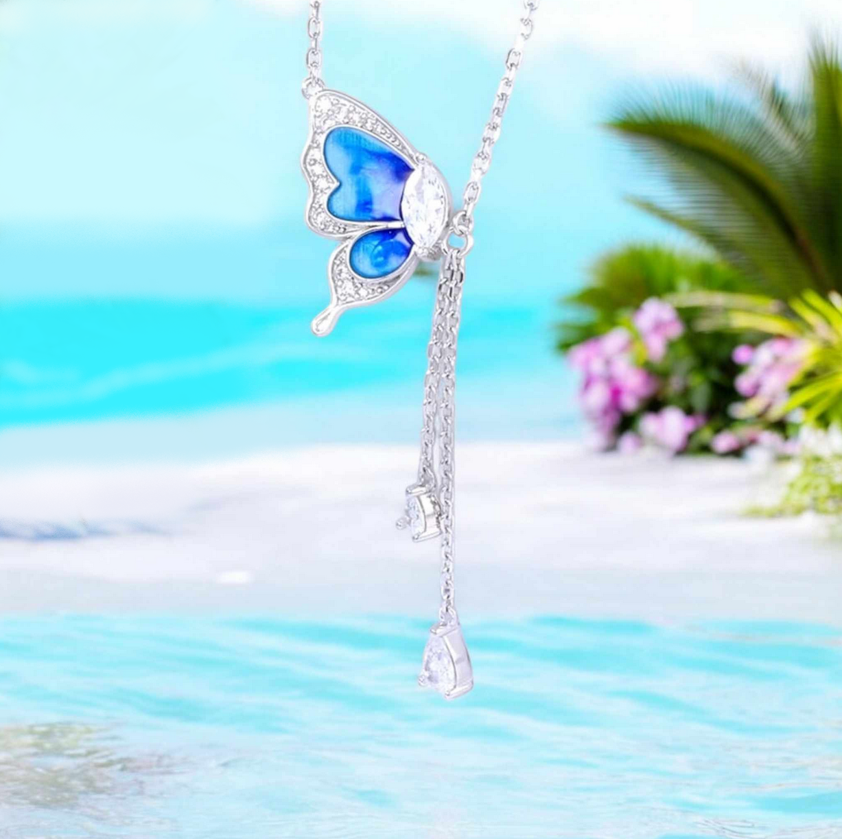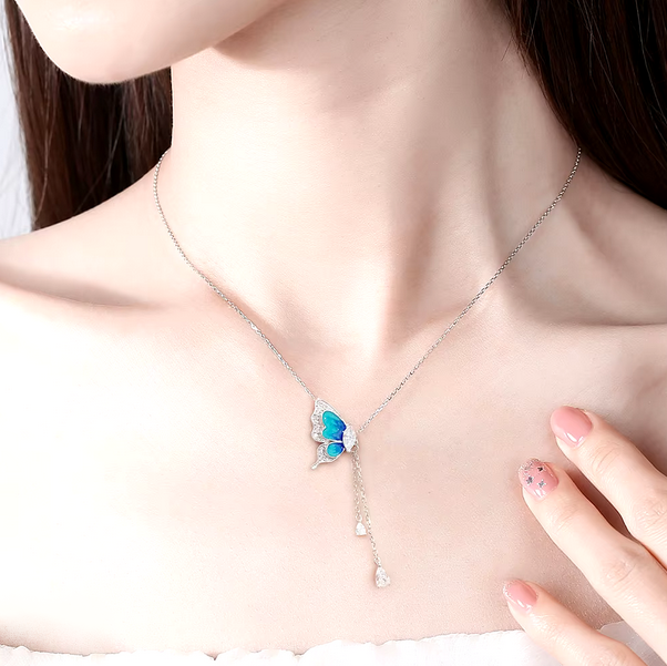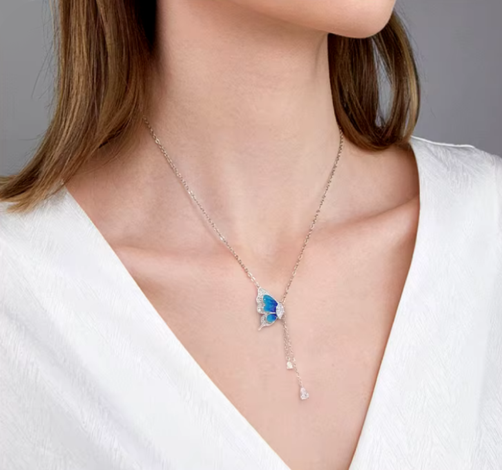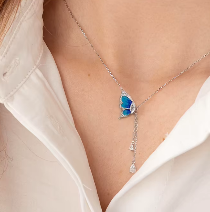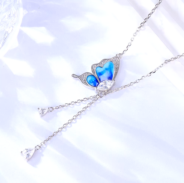 Exquisite 18K 925 Sterling Silver Gradient Blue Zircon Butterfly Tassel Pendant