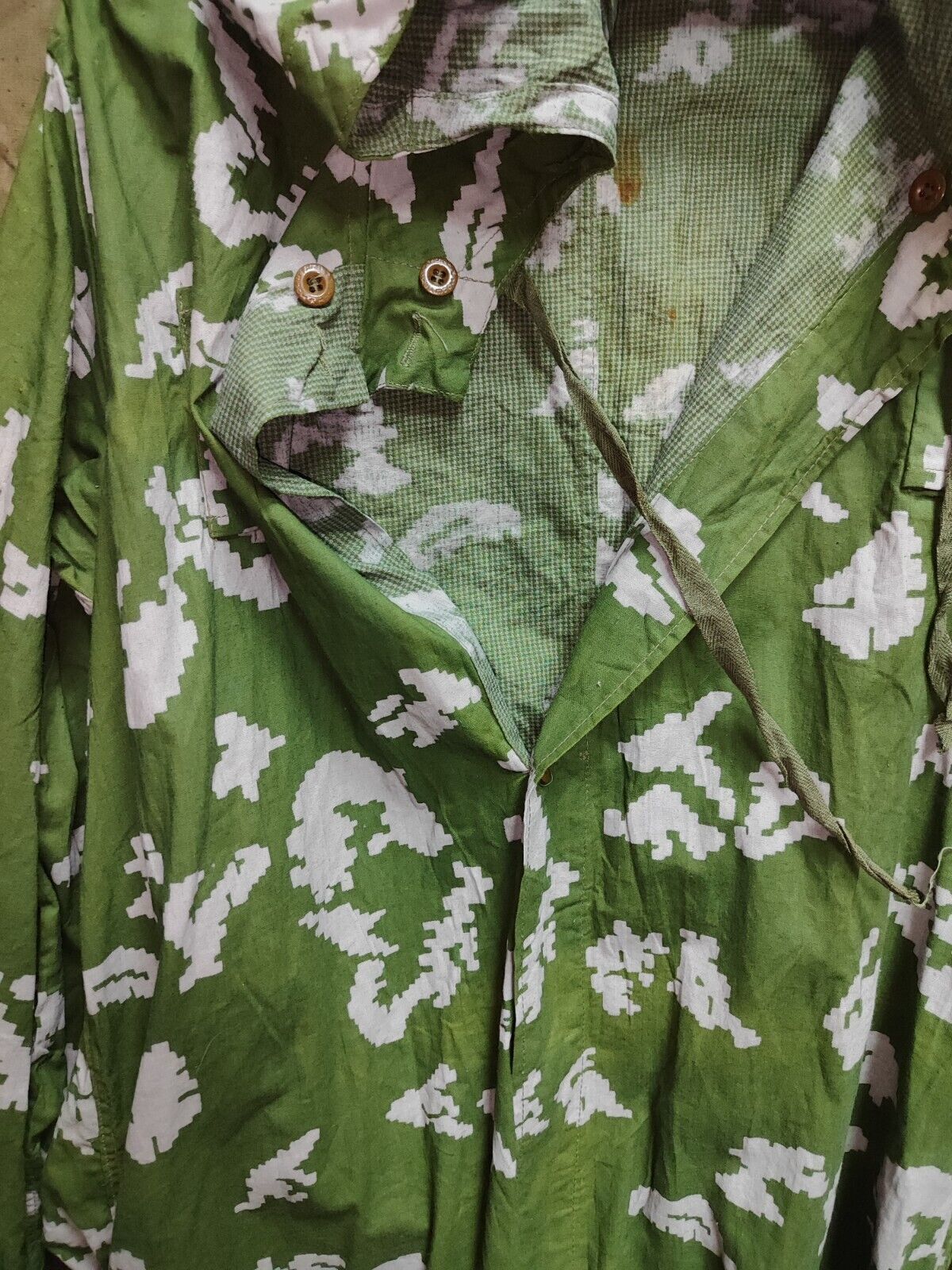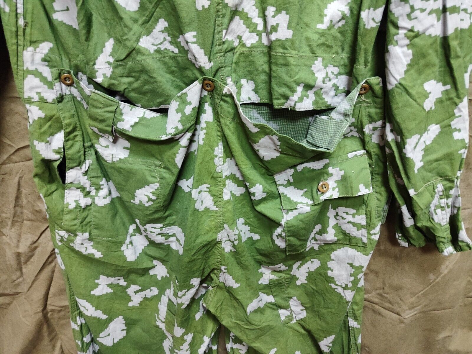 Manufacturer: Lukhovitskaya sewing factory. The jumpsuit was developed in the USSR for the border troops, and was also used in the Airborne Forces, scouts, snipers, chemical protection troops. It is worn over the form to create a camouflage effect, it is a single piece, excluding debris and dirt getting under it. The camouflage suit is equipped with special pockets for additional camouflage by vegetation. Has 2 pockets on the back of the jumpsuit (inner and outer) and a strap for a belt. Made in the USSR. An olive-colored fabric with randomly scattered light green spots. This color is still one of the best for deciduous forests in the summer. The shapelessness of the jumpsuit only enhances the masking effect. The jumpsuit is sewn of cotton fabric, which does not rustle when moving, it is well blown, after several washings it stops shrinking. Fastens with buttons to the base of the abdomen. The hood is adjustable so you can wear a variety of hats underneath.