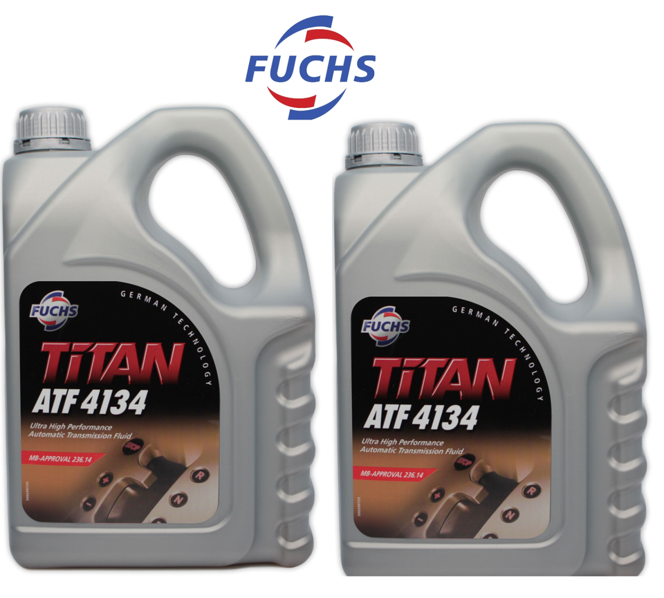 ENG-FUCHS TITAN ATF 4134 FLUID, GEAR OIL, TRANSMISSION FLUID BY FUCHS GERMANY, 600631703, TITAN ATF-4134, MB 001989680310, PAIL 4 LITERS=4.20 QTS. $50.00 (MB USA LIST $100.00), CASES 20 LITERS (4LX5 UNITS), 21 US QTS. New Part Number 001989680313, Automatic Transmission Fluid (PAILS 4L)