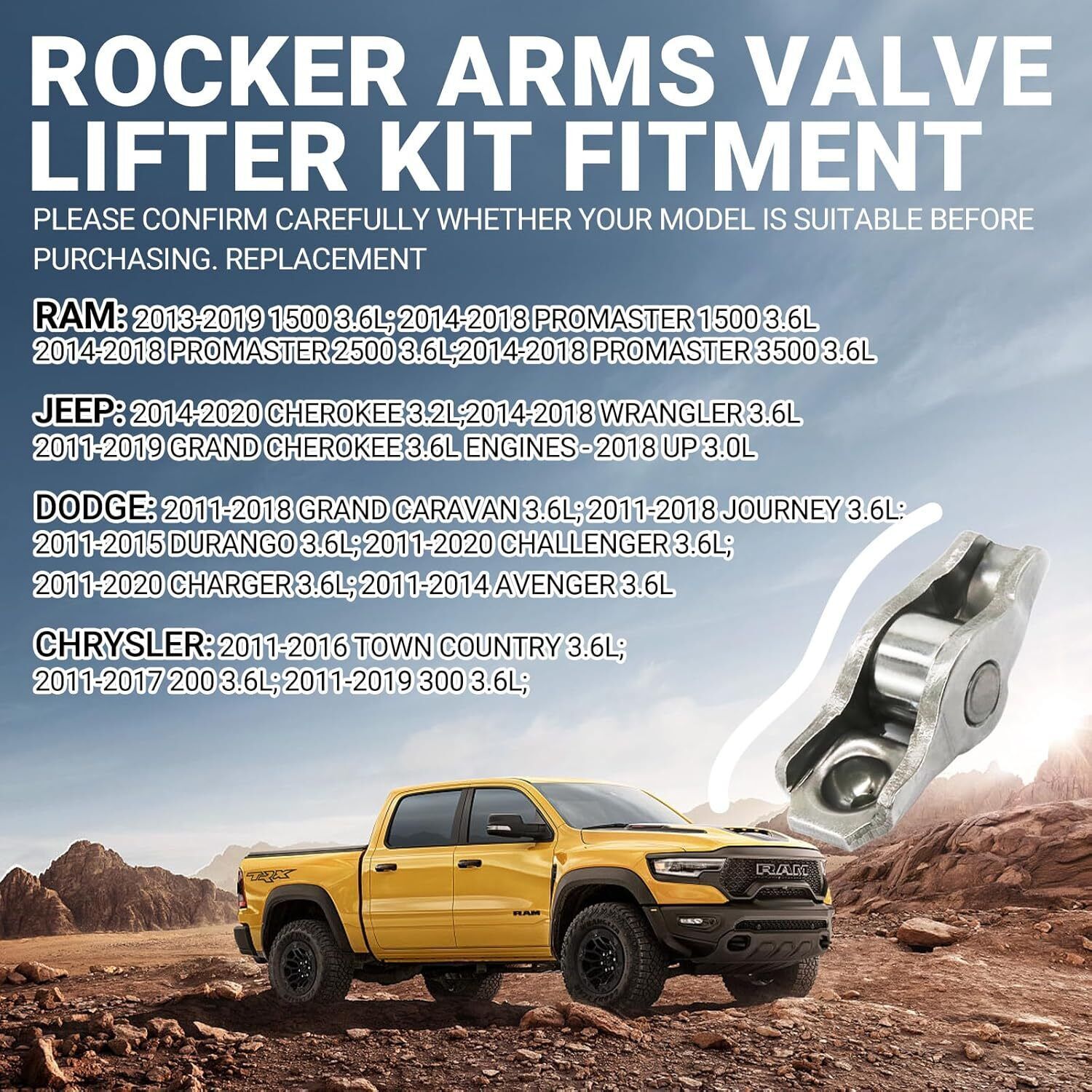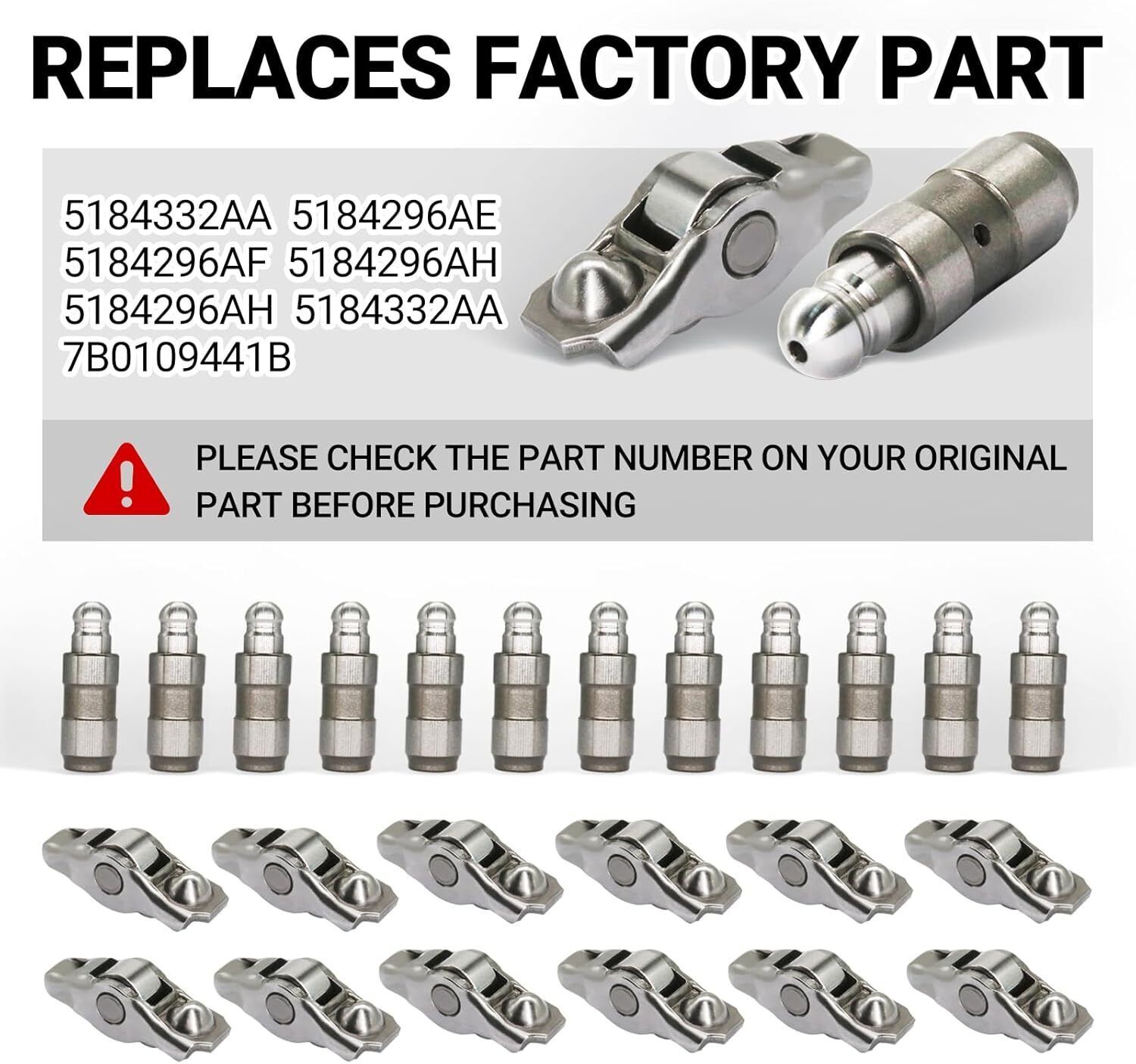 Fits For - - Rocker Arms Lifters are compatible with 2002-2010 Dodge Ram 1500 Dakota Durango Nitro Jeep Grand Cherokee Liberty Commander. Rocker Arms Valve lifters Lash Adjusters. Please check compatibility to make sure this part fits for your vehicle before purchase. Replace Part Number - - 53021077,5073596AA,53020742AC,53020742AB,53021913AB,68045794AA. HIGH QUALITY - - Rocker Arms Lifters are new aftermarket parts. Meeting original equipment (OE) specifications, they are direct replacements for original parts and will fit and function just as well as original parts. Buy with Confidence - - Our products are strictly tested during production to ensure quality, if you have any questions please feel free to contact us. Please Attention - - Please check compatibility, part photos, part numbers and part descriptions before purchasing in order to prevent incorrect purchases and unnecessary costs. If you are unsure or unaware, please feel free to contact us!