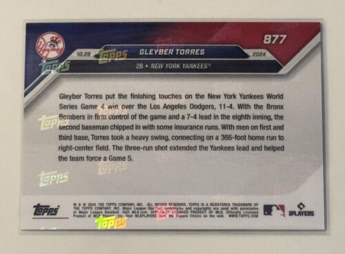Own a piece of history with this limited edition 2024 Topps Now sports trading card featuring Gleyber Torres, the talented player from the New York Yankees. This card commemorates Torres' impressive 3-run home run during the World Series, making it a must-have for any baseball fan or collector.