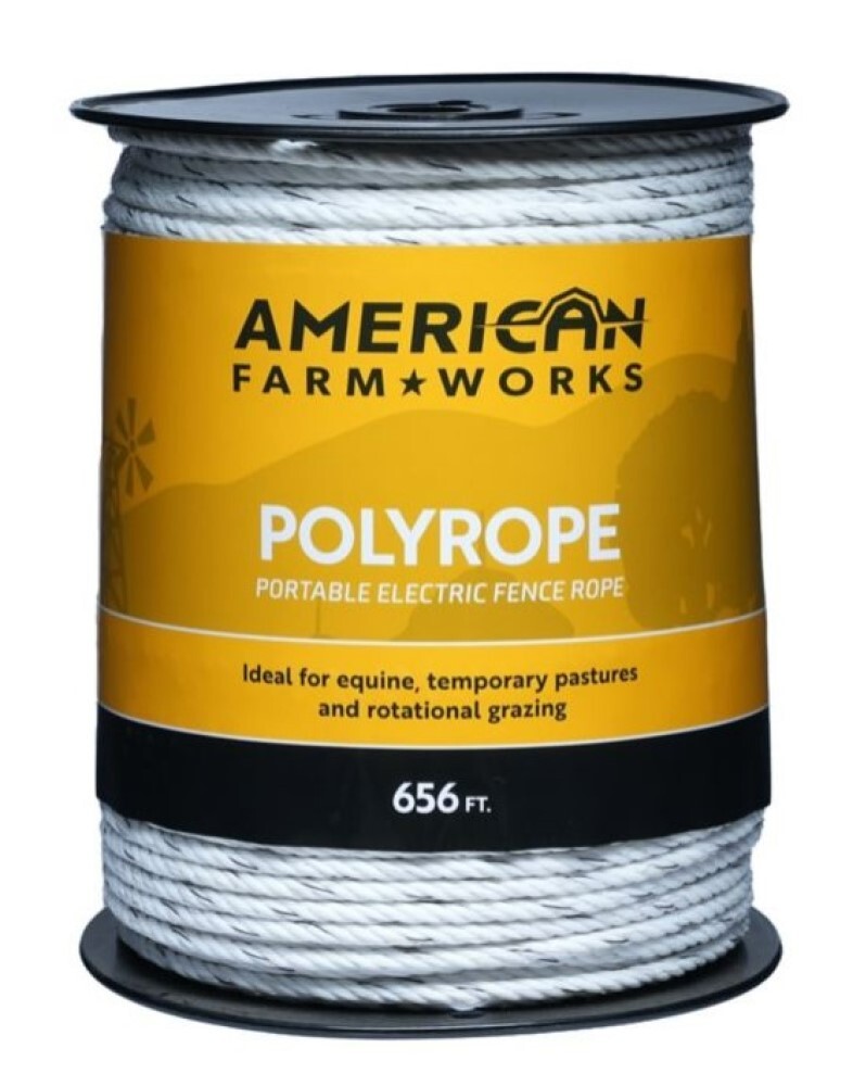 Woven with 6 strands of electrical conductors for optimal performance Lightweight fibers make it easy to install, repair and splice Spool contains 656 ft. (200 m) of polyrope electric fencing Breaking load: 820 lb. Durable poly electric fencing will not rust Please note: The American FarmWorks polyrope fencing is not designed to function under extreme tension and must be used in conjunction with a permanent fence.