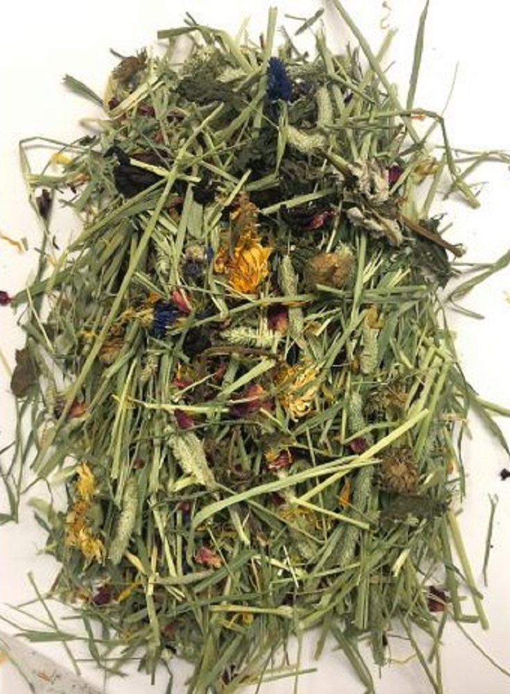 Part of a complete diet for rabbits, hamsters, gerbils, guinea pigs and chinchillas Made of herbs and flowers that contain natural nutrients, vitamins, minerals and proteins Long-strand source of high-fiber that helps support digestion No additives and preservatives Ingredients: Timothy Hay, Rose Petals, Hibiscus Flowers, Marigold Flowers, Nettle Leaves, Birch Leaves, Raspberry Leaves, Blue Cornflowers, Chamomile Flowers
