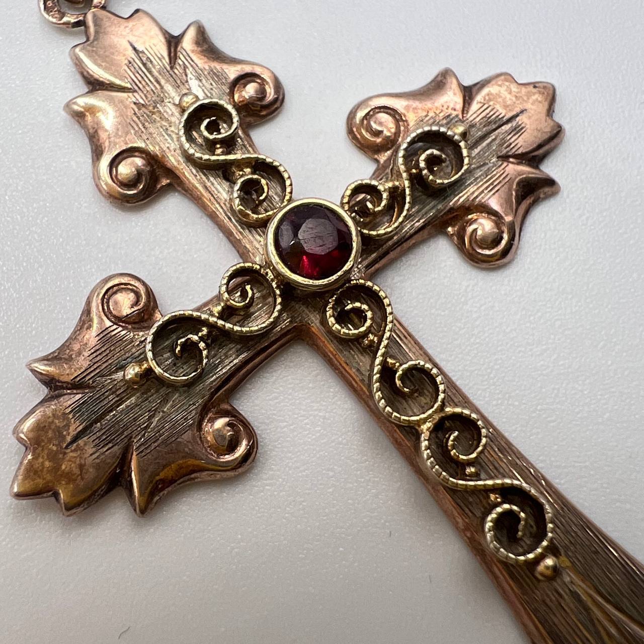 Unusual Vintage Gilt Silver 835 Christian Jewelry Pendant Cross Garnet Marked