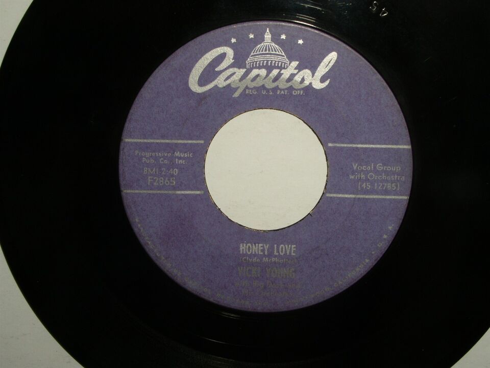 This is a vintage 45 rpm phonograph record by Vicki Young entitled, "Honey Love". Flipside: "Riot In Cell Block Number Nine". Record label Capitol F2865.
