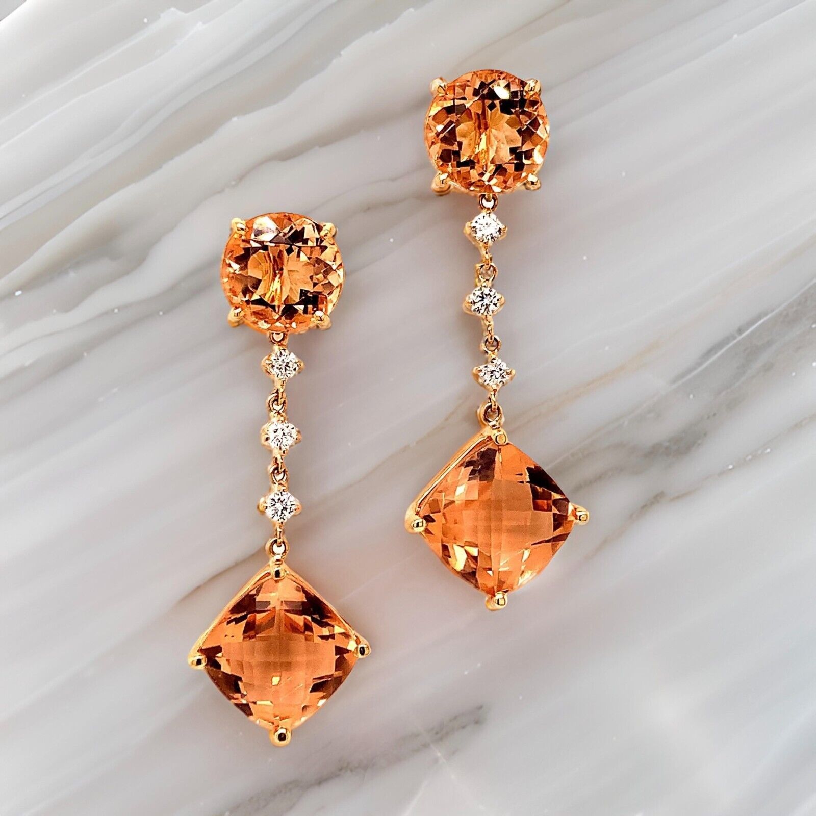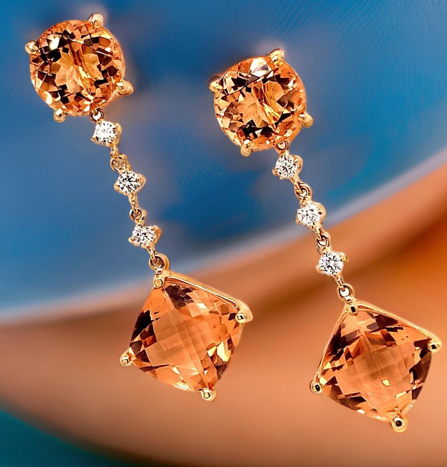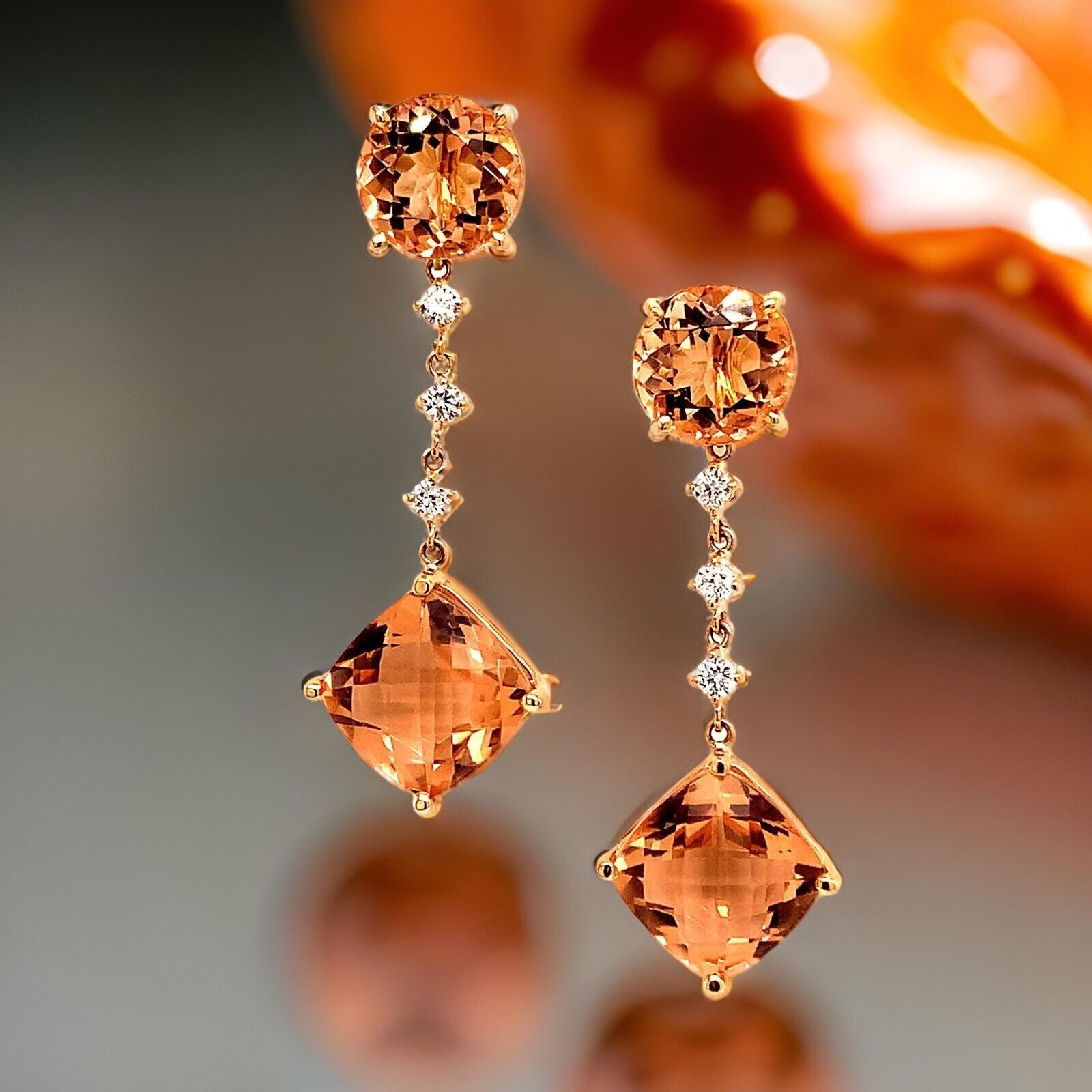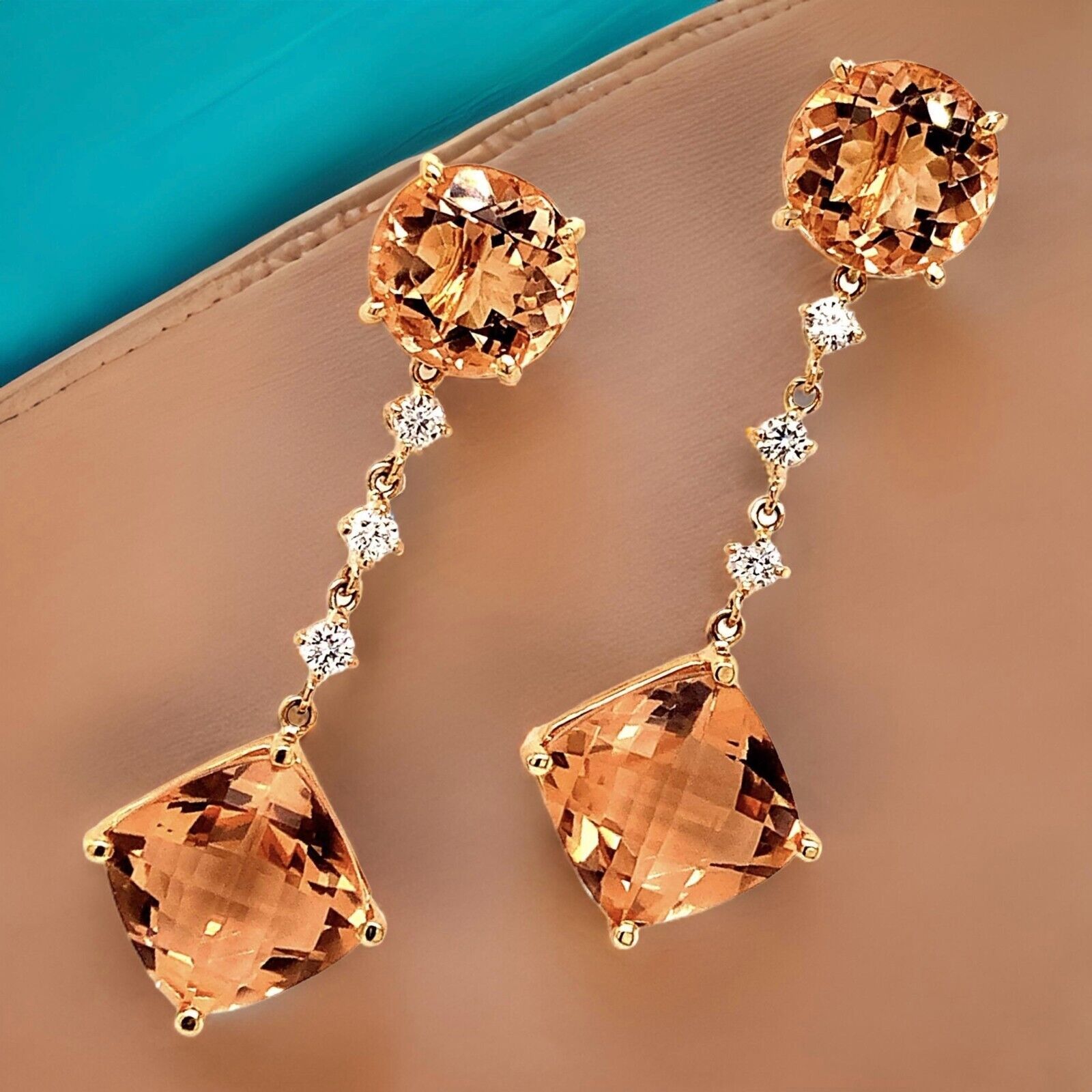 Custom made Natural Finely Faceted Quality Morganite and Diamond Earrings set in 14k yellow Gold with a total ct weight of 10.1 TCW