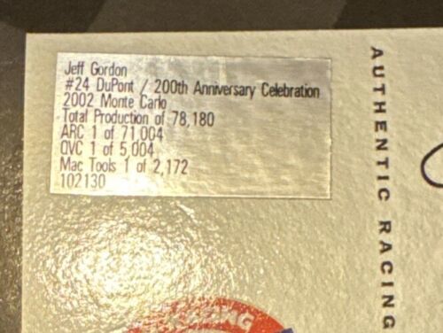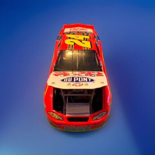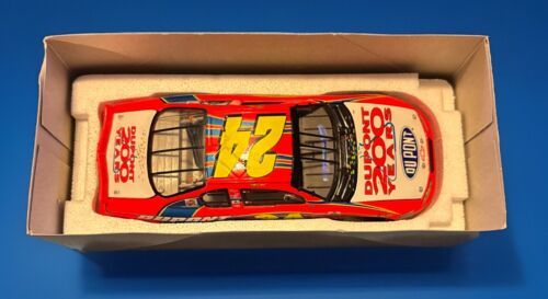 This limited edition 1:24 scale diecast model of the iconic Jeff Gordon's 2002 Monte Carlo is a must-have for any NASCAR fan. The car features a multi-color design with the DuPont logo and is an original box and styrofoam advertising specimen.