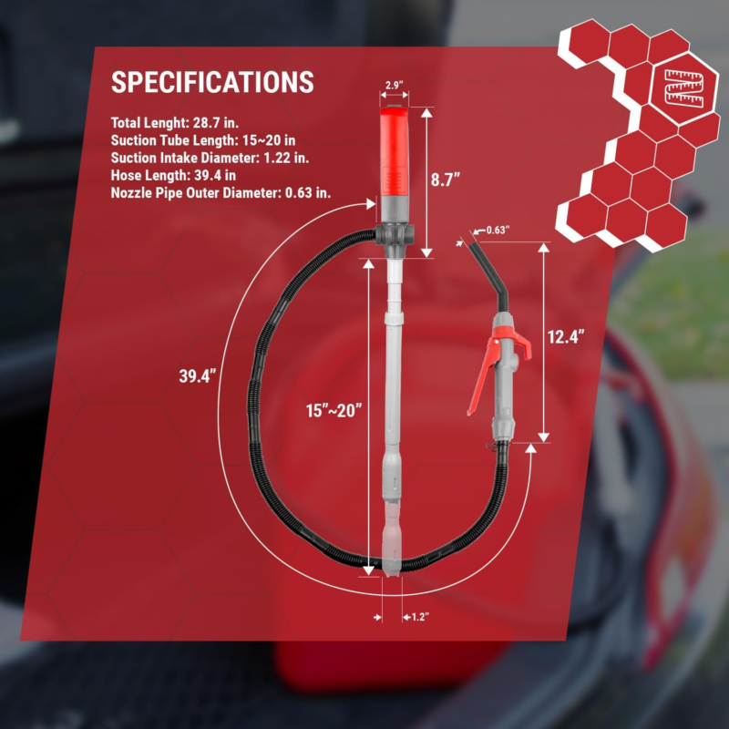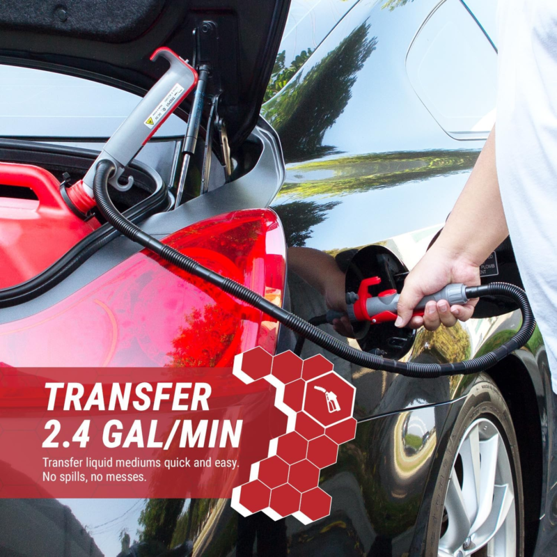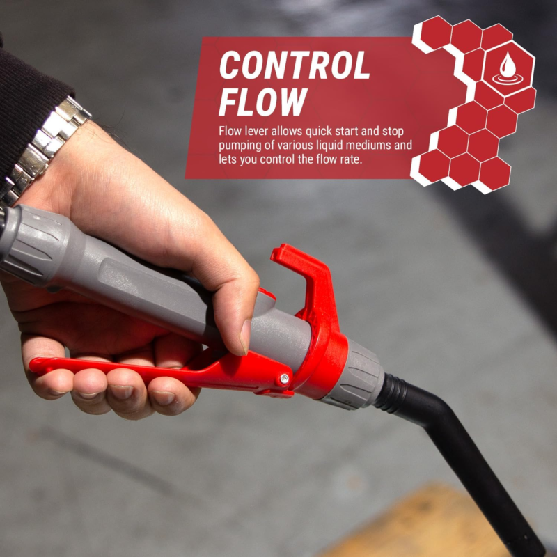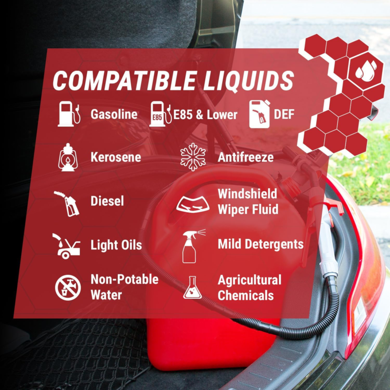RECOMMENDED - Compatible with gas, diesel, DEF (AdBlue), water, kerosene, antifreeze, windshield washer fluid, mild detergents, agricultural chemicals and light oils. Insert pump into a fuel container and secure the nozzle into the receiving end, flip the switch and squeeze the nozzle