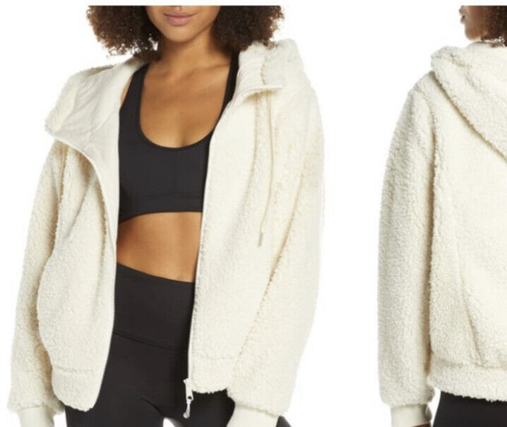 Zella Sadie Farrah Bomber Fleece Hooded Sherpa Jacket Large Ivory Dove RET 89.00