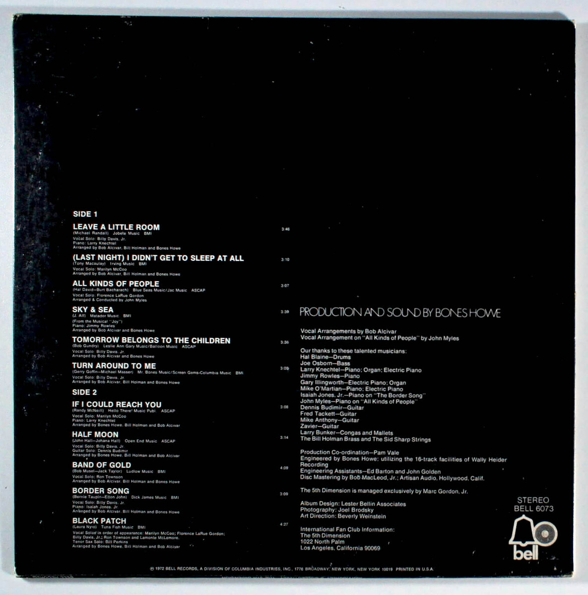 Individually Collectively, by The 5th Dimension, includes both of the group's final top 10 hits on the Billboard Pop Singles chart - (Last Night) I Didn't Get To Sleep At All, (No. 8) and If I Could Reach You (No. 10). Both were also hits on the Adult Contemporary charts, and both feature lead vocals by Marilyn McCoo. The album would scale the Top 200 Album Charts as well, eventually landing at the No. 58 position. The album's title is reflective of the record containing content in which the group goes from its famous five-part harmonies to lead-feature songs. Billy Davis, Jr. is the lead on nearly half of the album, including on the group's cover of Elton John's Border Song. Ron Townson is also issued a rare lead vocal on Band of Gold. Black Patch, a Laura Nyro composition which ends the album, features each member taking lead on part of a verse, including - for the first time - Lamonte McLemore. The group would perform this final song on Soul Train, along with the 1973 non-album single, Flashback.