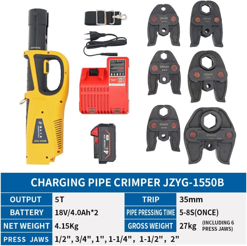 Multiple Crimping Heads. Our machine has 1/2 ", 3/4", 1 ", 1-1/4",1-1/2",2" 6 kinds of Pro Press Jaws.Press Jaws is manufactured in standard copper pipe sizes and is suitable for the major pipe manufacturers on the market. If you need to crimp PEX tubes and stainless steel tubes, make sure the dimensions are correct.