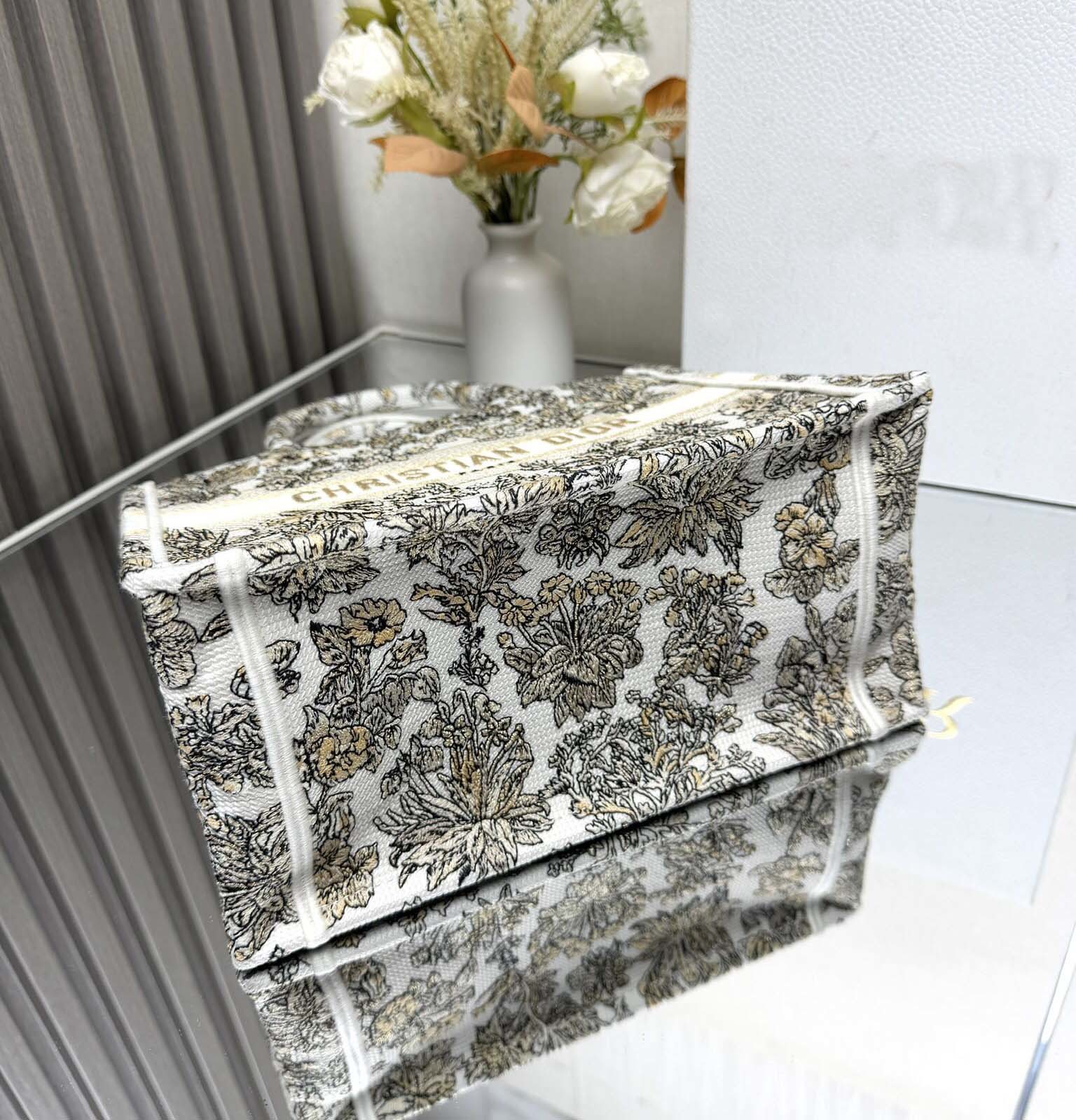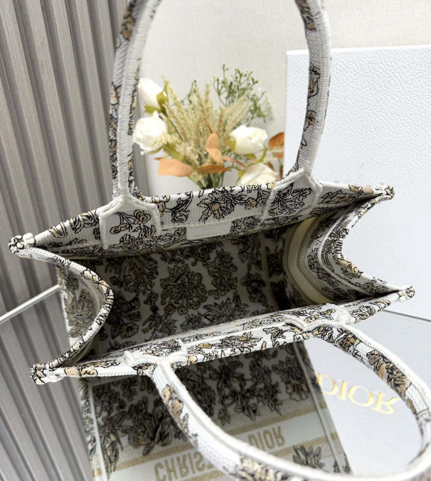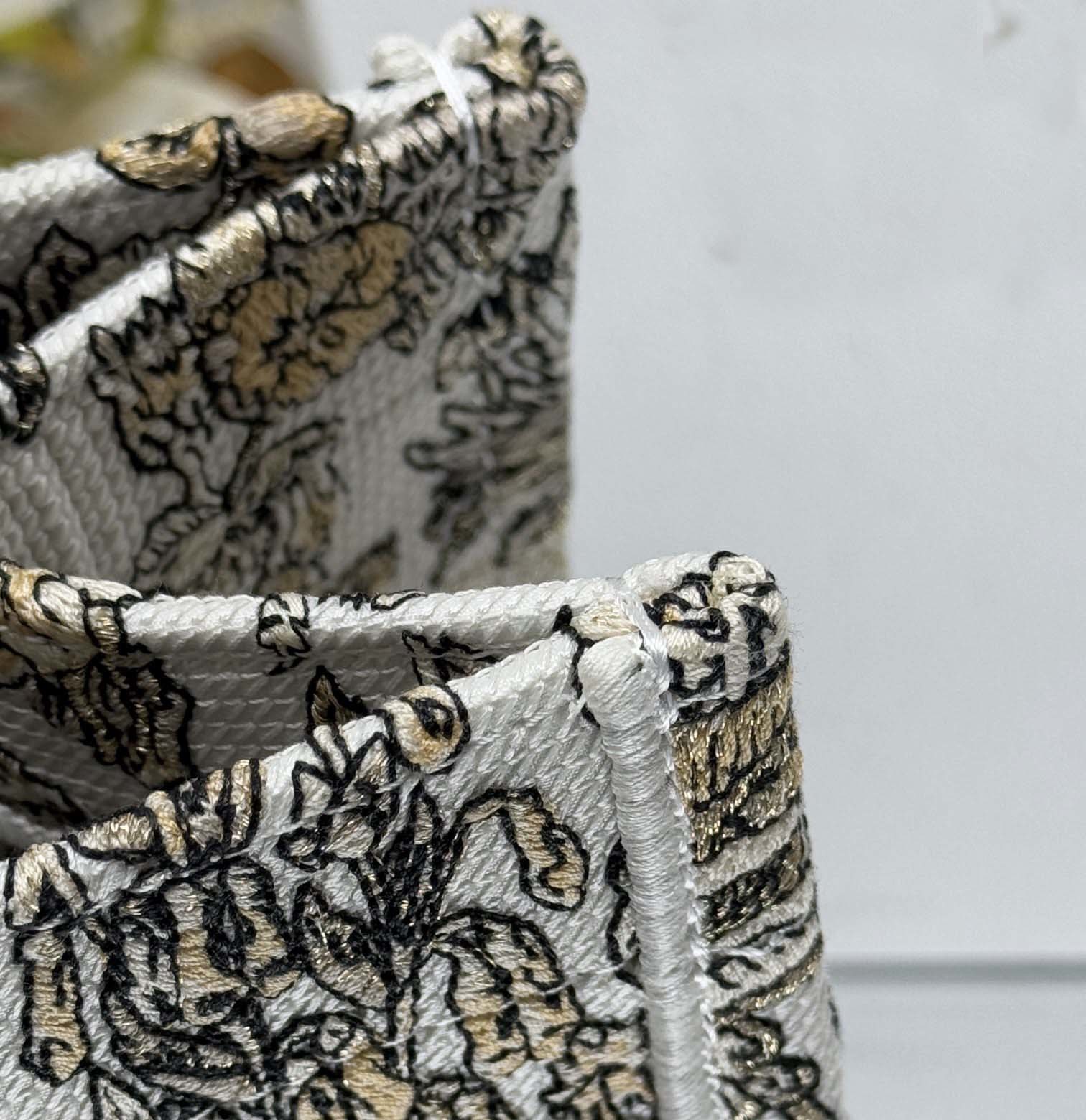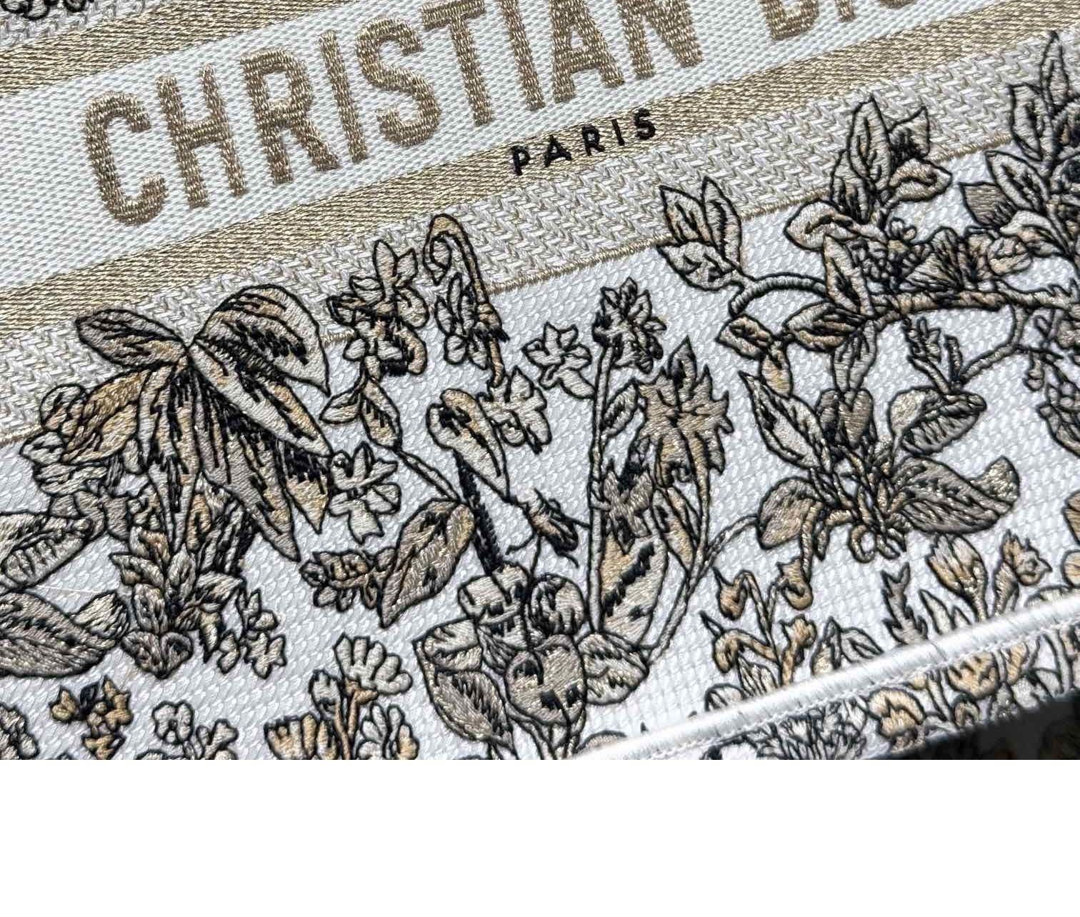 the Book Tote has become a staple of the bag aesthetic. Created to hold all the daily essentials, the latte style is fully embroidered with the gold-tone Millefiori Unicorn motif by Pietro Ruffo, showcasing a symbol from Scottish mythology, the unicorn, within a poetic floral pattern. Adorned with the Paris signature on the front, the large tote exemplifies the House's savoir-faire and can be carried by hand or worn over the shoulder.