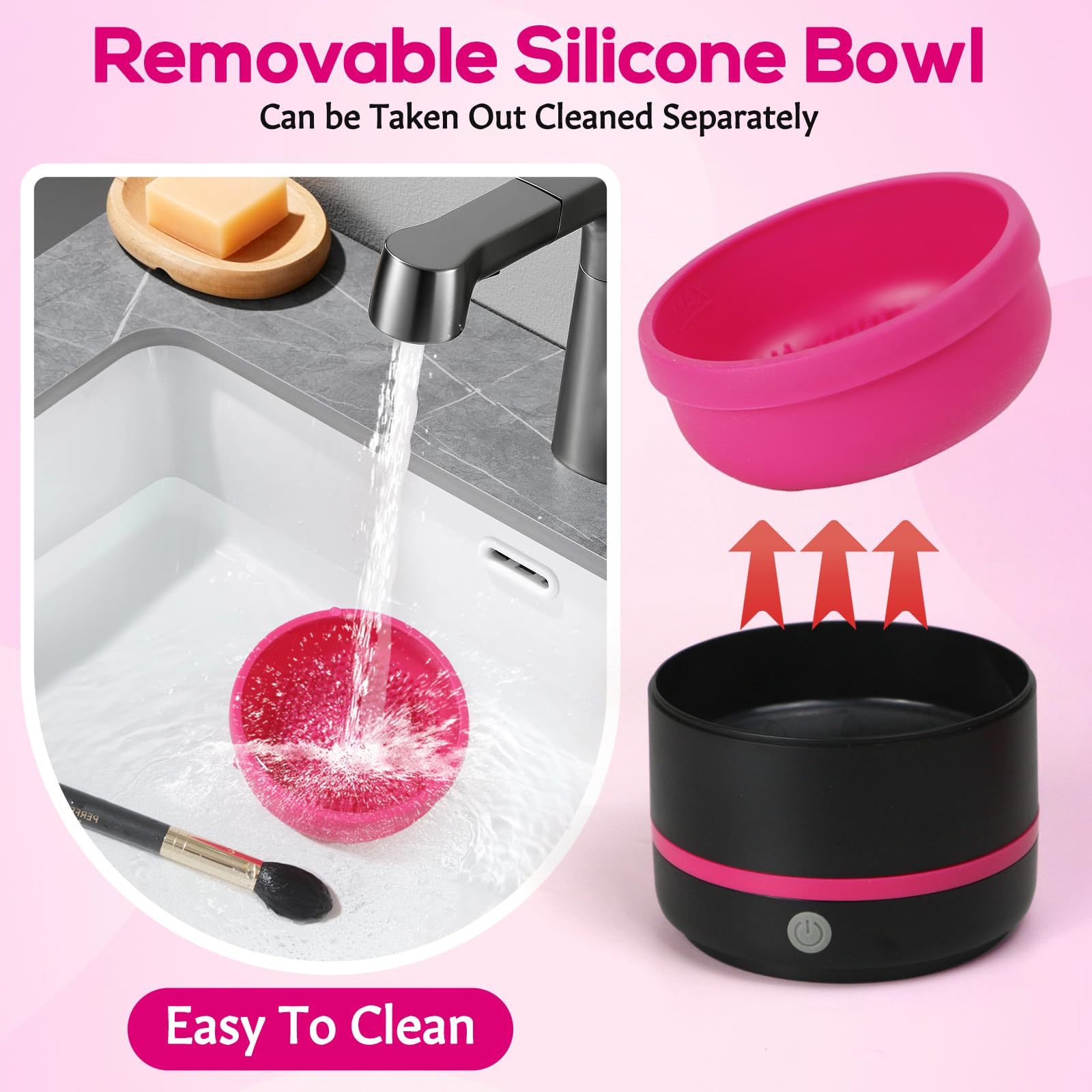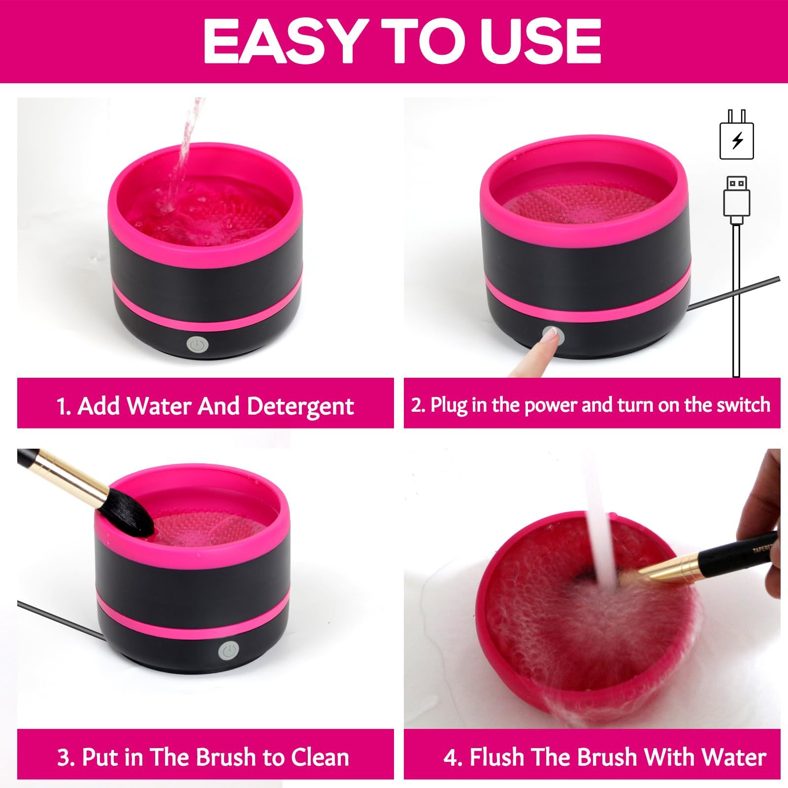 EASY TO USE: Cosmetic brushes cleaner has a one-button switch design, just connect the plug and press the switch to start makeup brush cleaning. USB plug-in design, plug and play, easy to operate. It's suitable for users of all skill levels. Silicone brush cleaning bowl is removable, it is easy to clean and can be used separately.