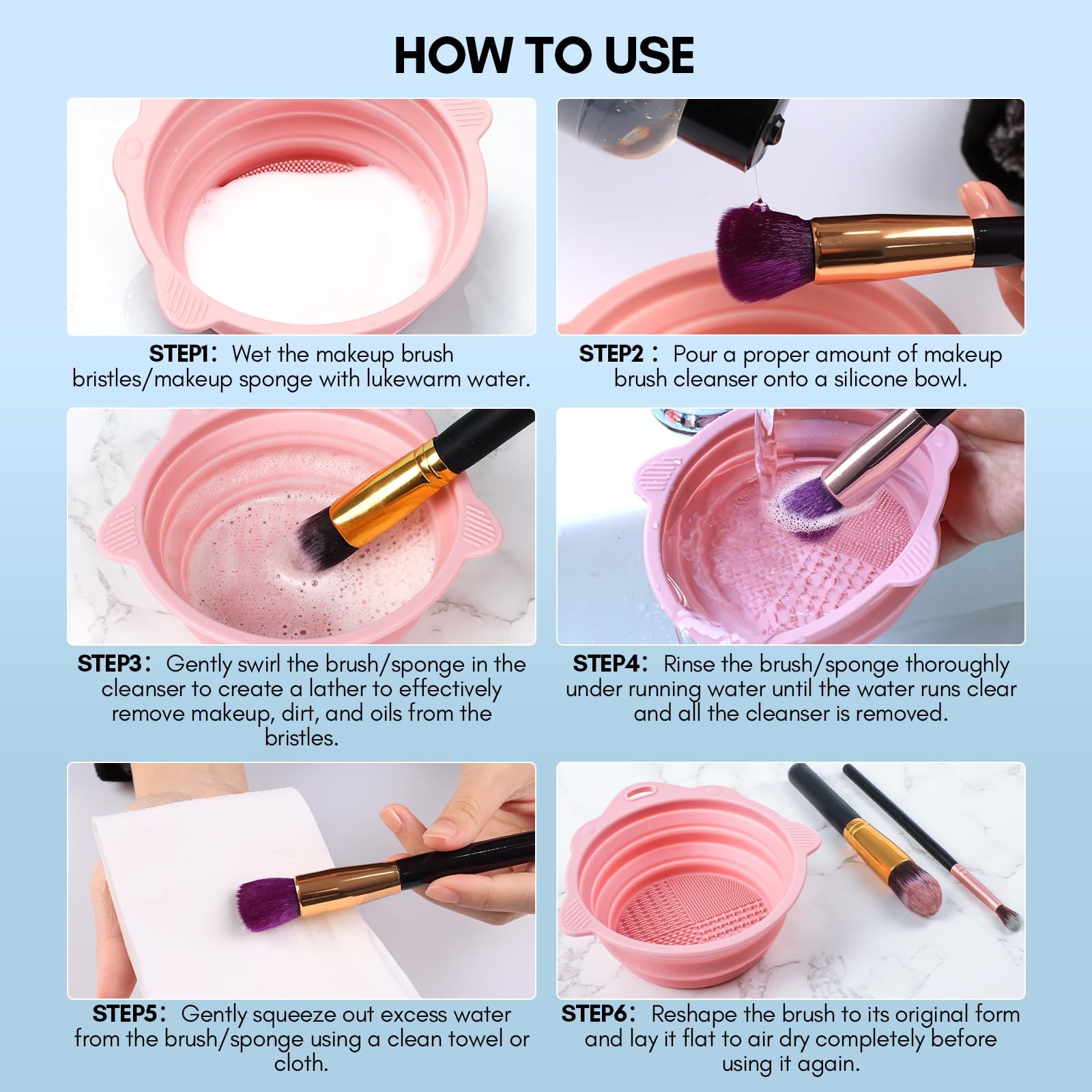 [Set includes]Makeup Brush Cleaner Set Includes:2 bottles of 2.02Fl Oz Makeup brush cleaner and 1psc foldable makeup brush cleaning bowl in one set.Our silicone makeup brush cleaner tool is made of nice silicone material, which will not damage the shape and softness of the hair of the cosmetic brush and manicure brush during the cleaning process.And it can be reused and not easily deformed.