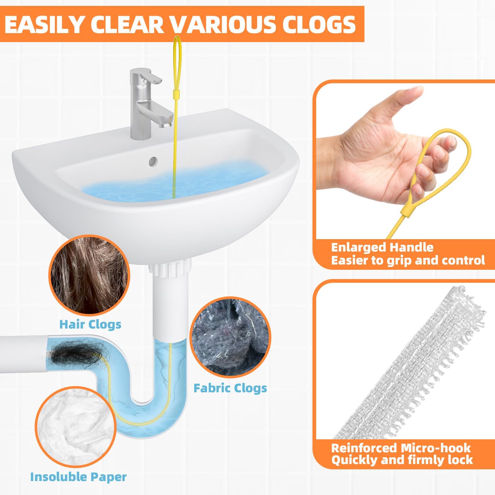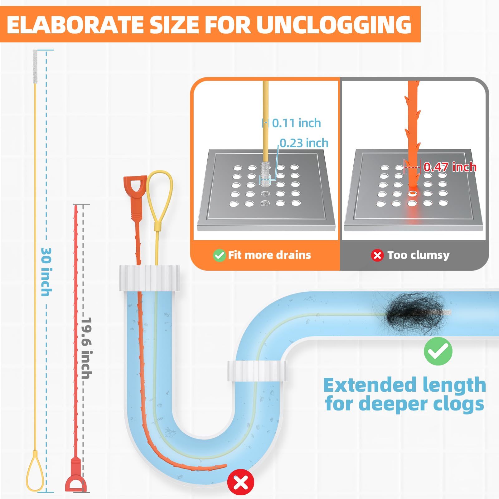 Innovative Practical Designs for Efficient Unclogging: Fortified using sewing and glue, the micro-hook of our plumbing snake is securely attached to the wand to prevent worse clogs of a falling hook. Unlike barbed snake, this sink snake drain tool removes barbs and has a slimmer hook head of 0.23", which helps the shower snake to easily get into the pipes without removing the drain stopper. Moreover, the round stick and the larger looped handle also facilitate easy spinning and movement.