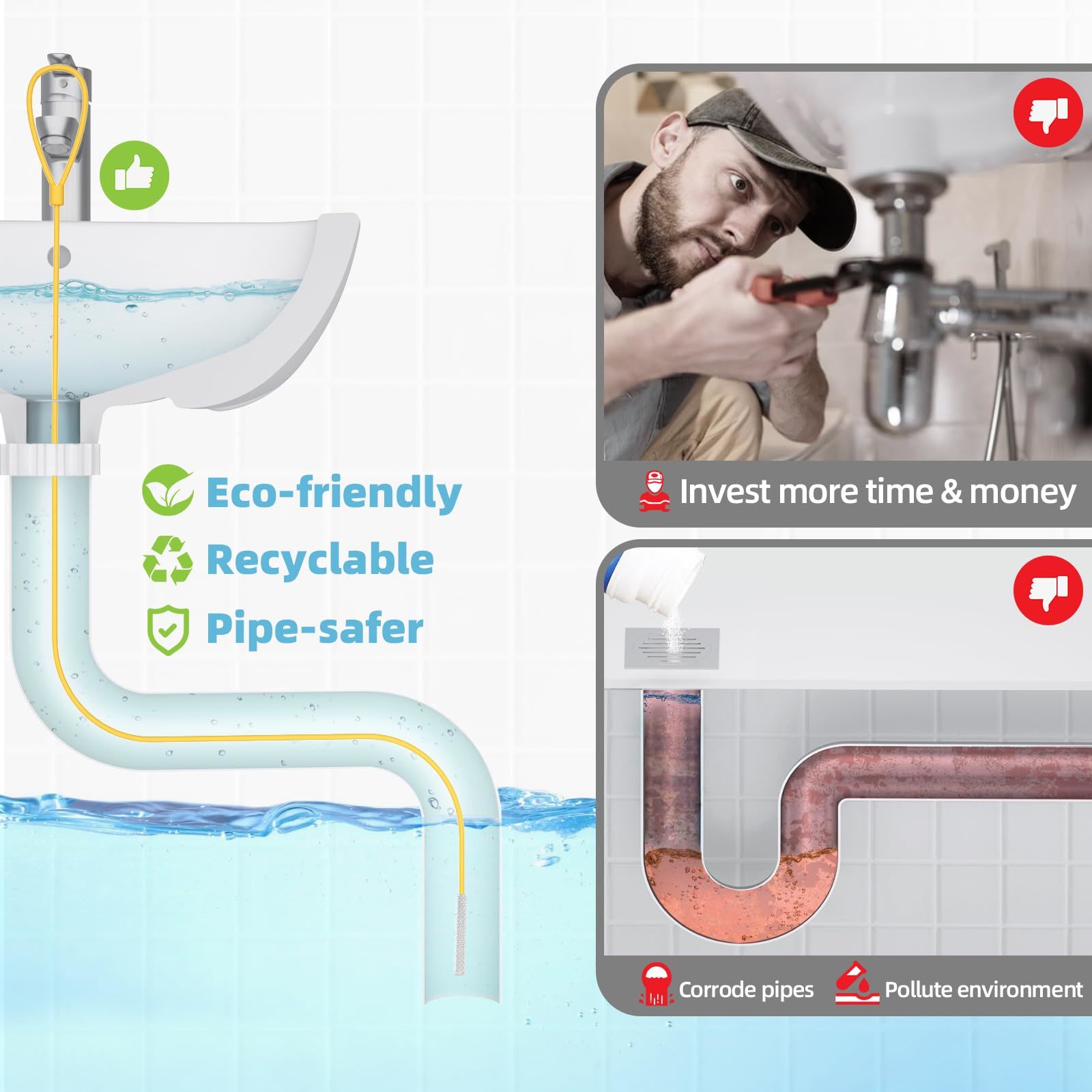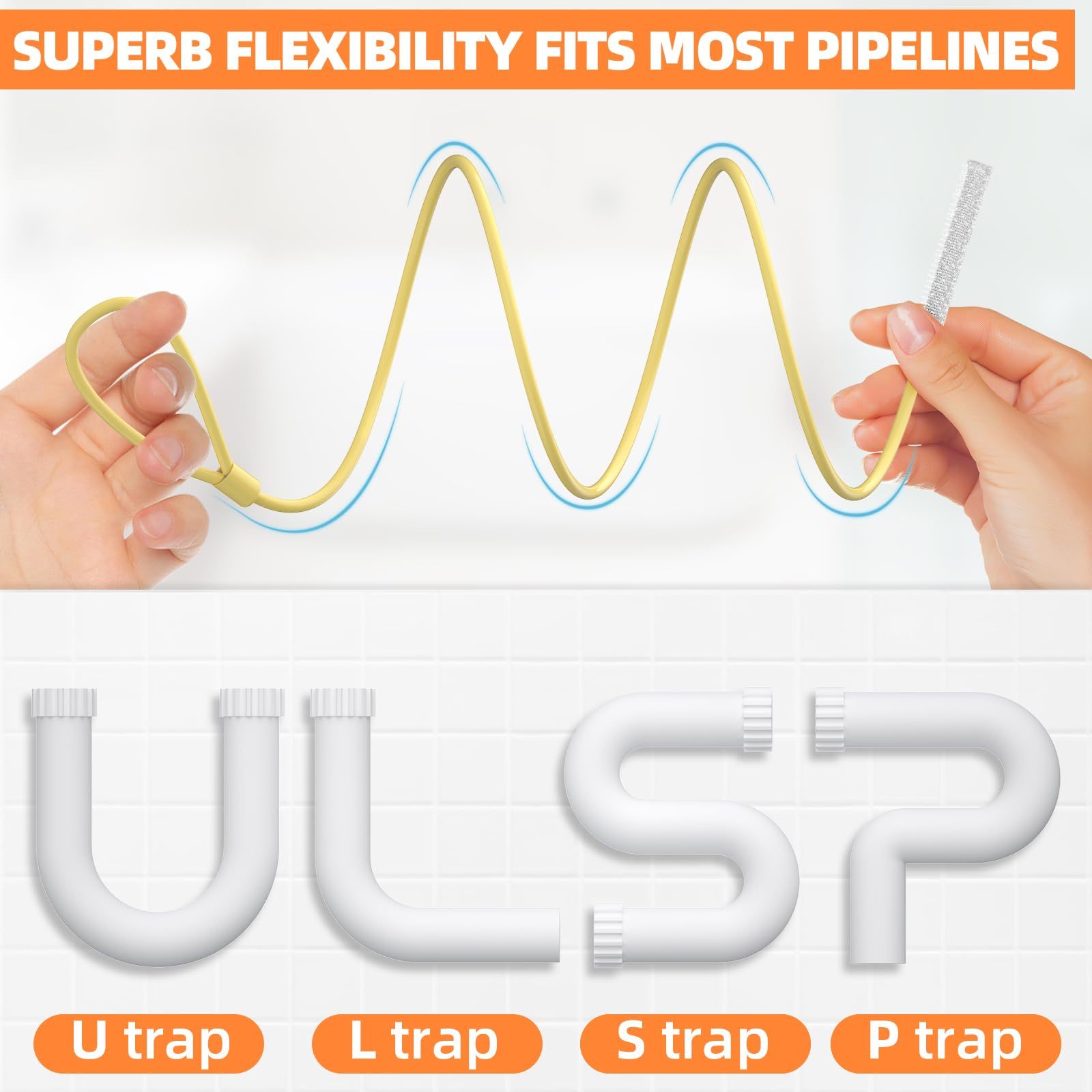 Anti-Break Steel Hair Clog Remover with Nylon Layer: Say goodbye to the flimsy plastic snake that distort with ease. Crafted from stainless steel, our sink drain cleaner boasts a higher rigidity and durability, maintaining the straight shape effortlessly without succumbing to deformation or breakage. Additionally, the ultra-slim 0.11" wand, along with the smooth and abrasion resistant nylon layer, ensure the flexibility for the snake to make its way through corners or sharp turns.